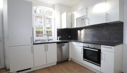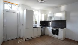Schöne Einbauküche mit Treppe zum Obergeschoss und Zugang zum Außenbereich und Garten, das Wohnzimmer, im vorderen Bereich, ist mit einem Pelletofen ausgestattet.