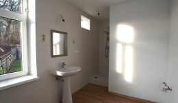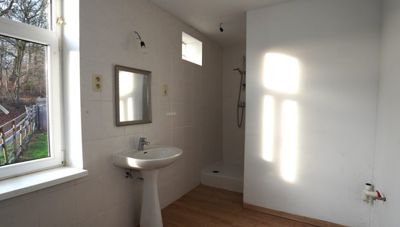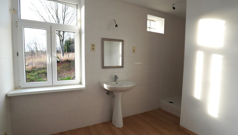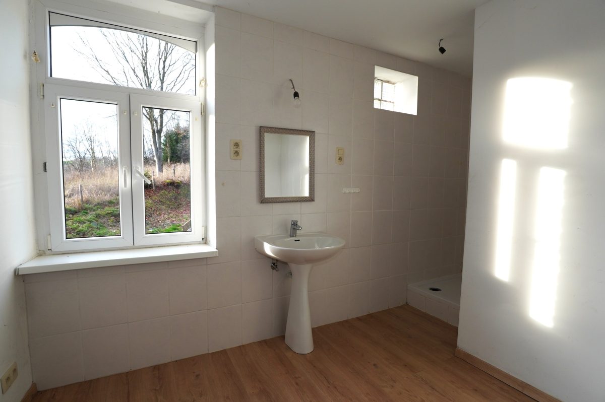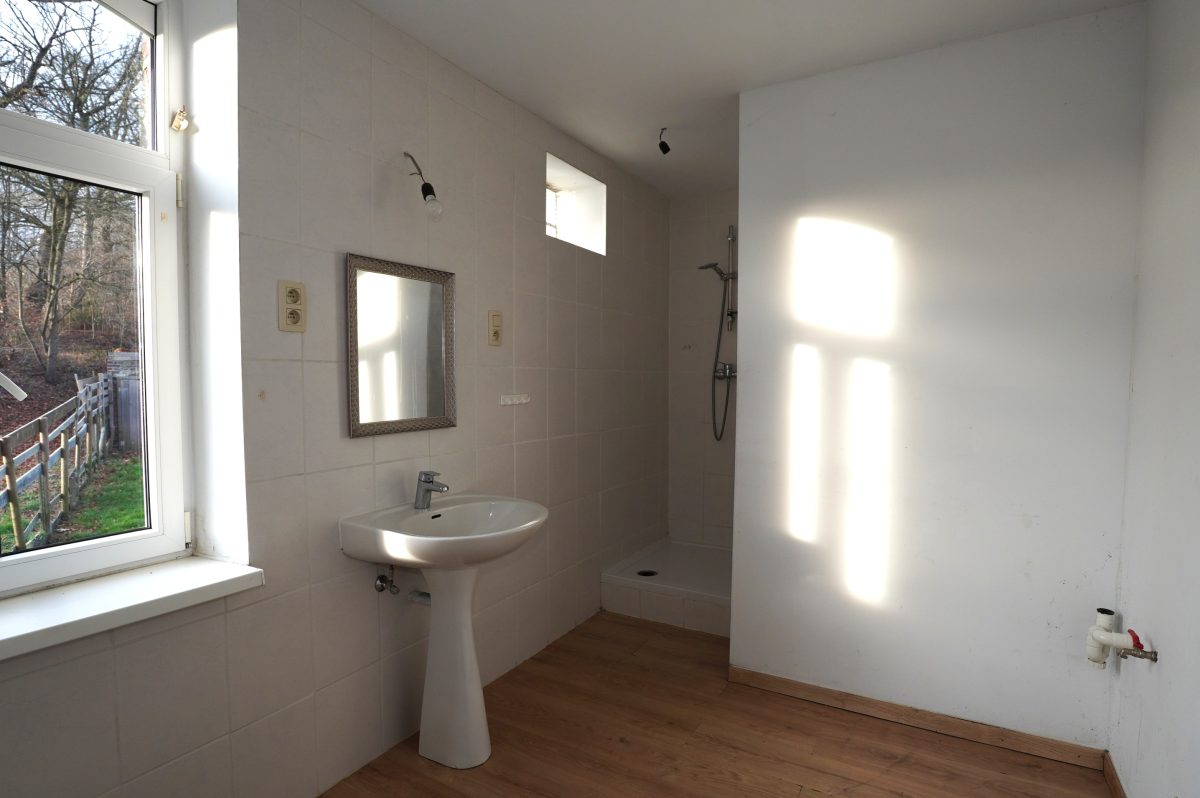 Der erste Stock besteht aus einem Flur, einem separaten WC, einem großen Schlafzimmer (das in zwei Räume unterteilt werden könnte) und einem Badezimmer mit Dusche, Waschbecken und Anschlüssen für eine Waschmaschine.