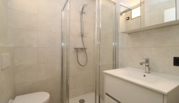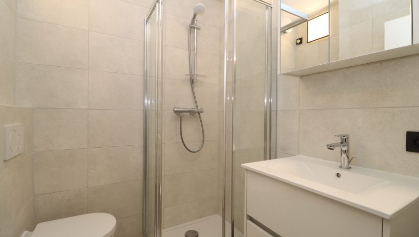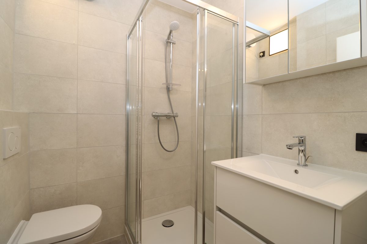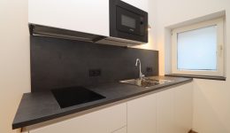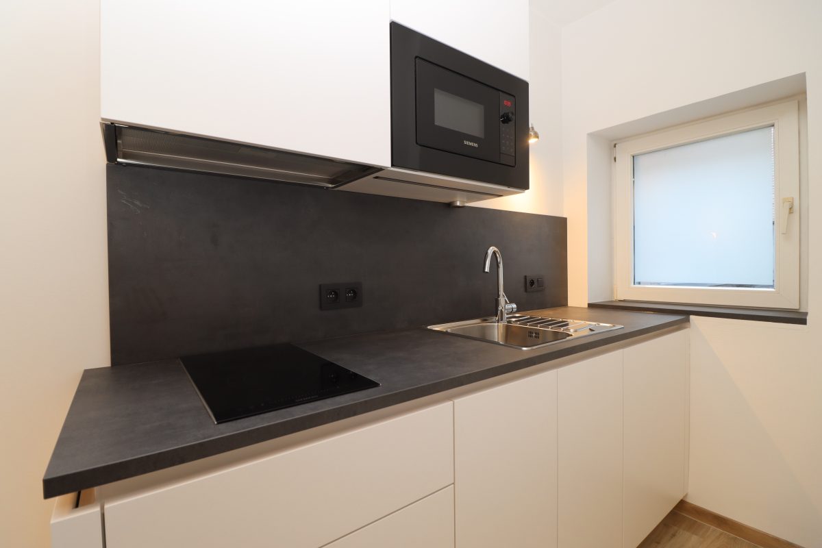 Wohn-Ess-Schlafraum mit kleiner, moderner Einbauküche, separates Bad mit Dusch, WC, Waschbecken und Badmöbeln.