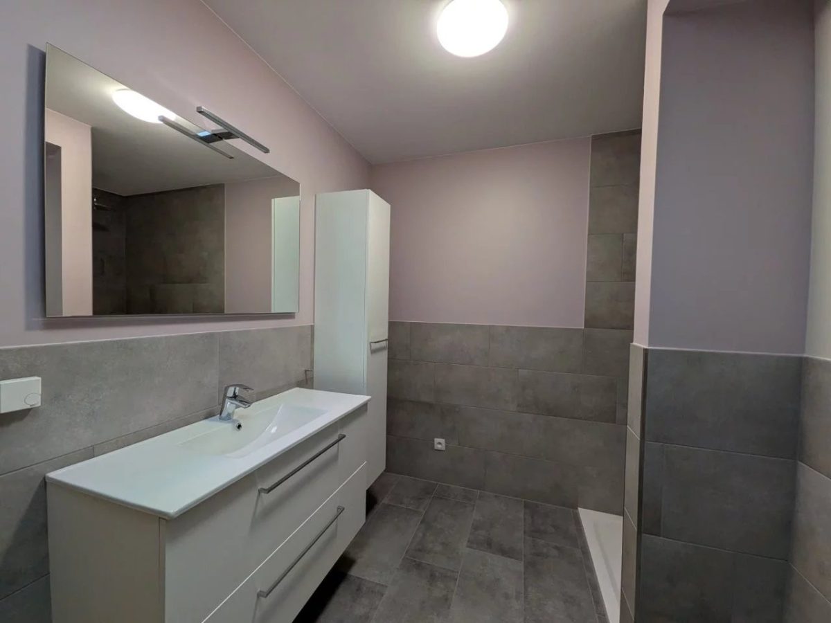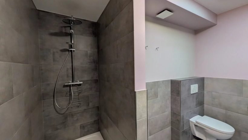 Das geschmackvoll geflieste Bad verfügt über eine großzügige italienische Dusche, WC sowie ein Waschbecken mit modernem Unterschrank. Ein Oberlicht sorgt für natürliches Tageslicht und zusätzliche Helligkeit.