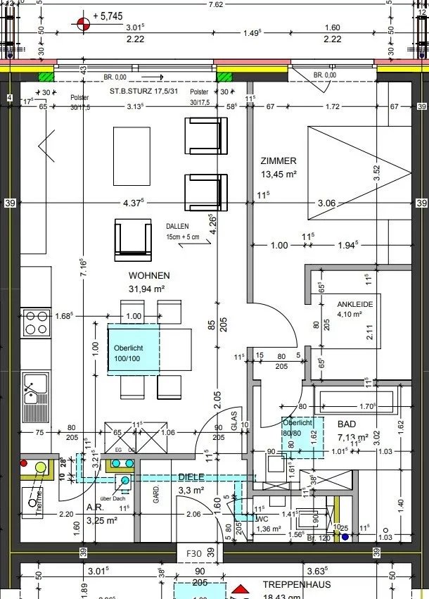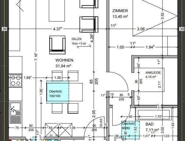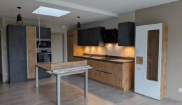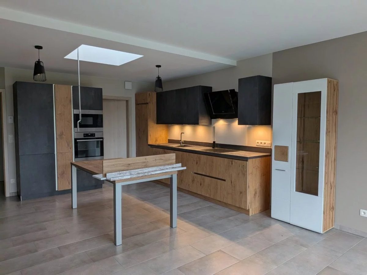 Das Herzstück der Wohnung bildet der großzügige Wohn- und Essbereich mit offenem Küchenkonzept auf ca. 32 m². Die moderne, hochwertige Einbauküche in stilvoller Holzoptik mit schwarzen Akzenten fügt sich harmonisch in den Raum ein. Große Fenster sowie ein zusätzliches Oberlicht im Küchenbereich sorgen für ein besonders angenehmes Raumgefühl.