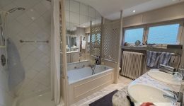Die separate Küche mit ca. 12 m² ist mit einer zeitlosen, neuwertigen Einbauküche ausgestattet und verfügt über einen direkten Zugang zur Terrasse. Ob der erste Kaffee am Morgen oder ein entspanntes Abendessen – dieser Ort verbindet Genuss mit Ausblick. Zwei weitere Räume auf dieser Ebene lassen sich flexibel als Büro, Gäste- oder Schlafzimmer nutzen und werden durch ein großzügiges Badezimmer mit Badewanne, Dusche, WC und Doppelwaschbecken ergänzt.