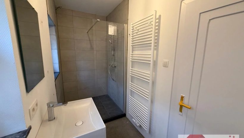 Das Badezimmer punktet mit einer bodengleichen, modernen Dusche, einem Waschbecken und zeitgemäßer Ausstattung. Ein separates WC ergänzt das Raumangebot und sorgt für zusätzlichen Komfort im Alltag.