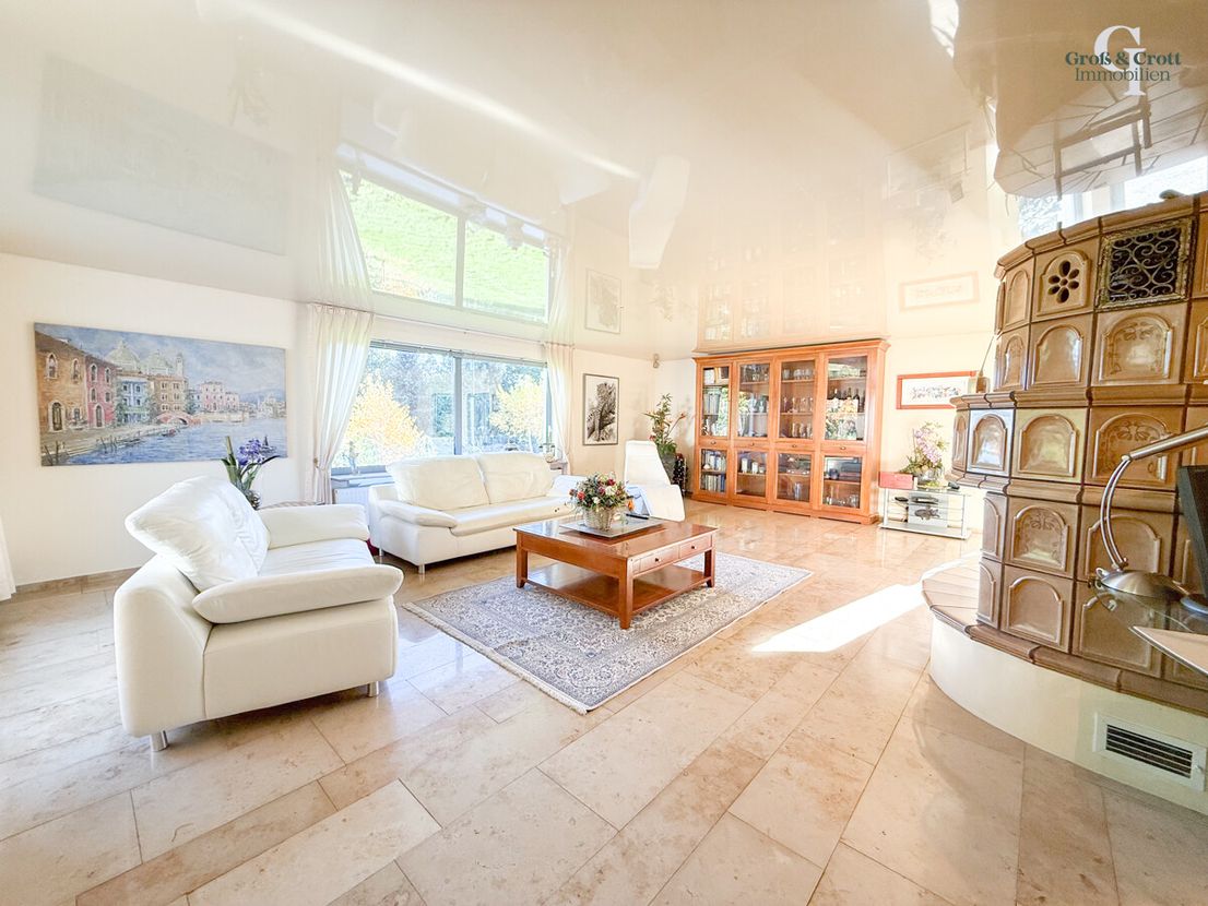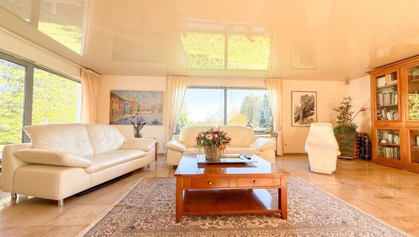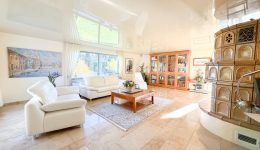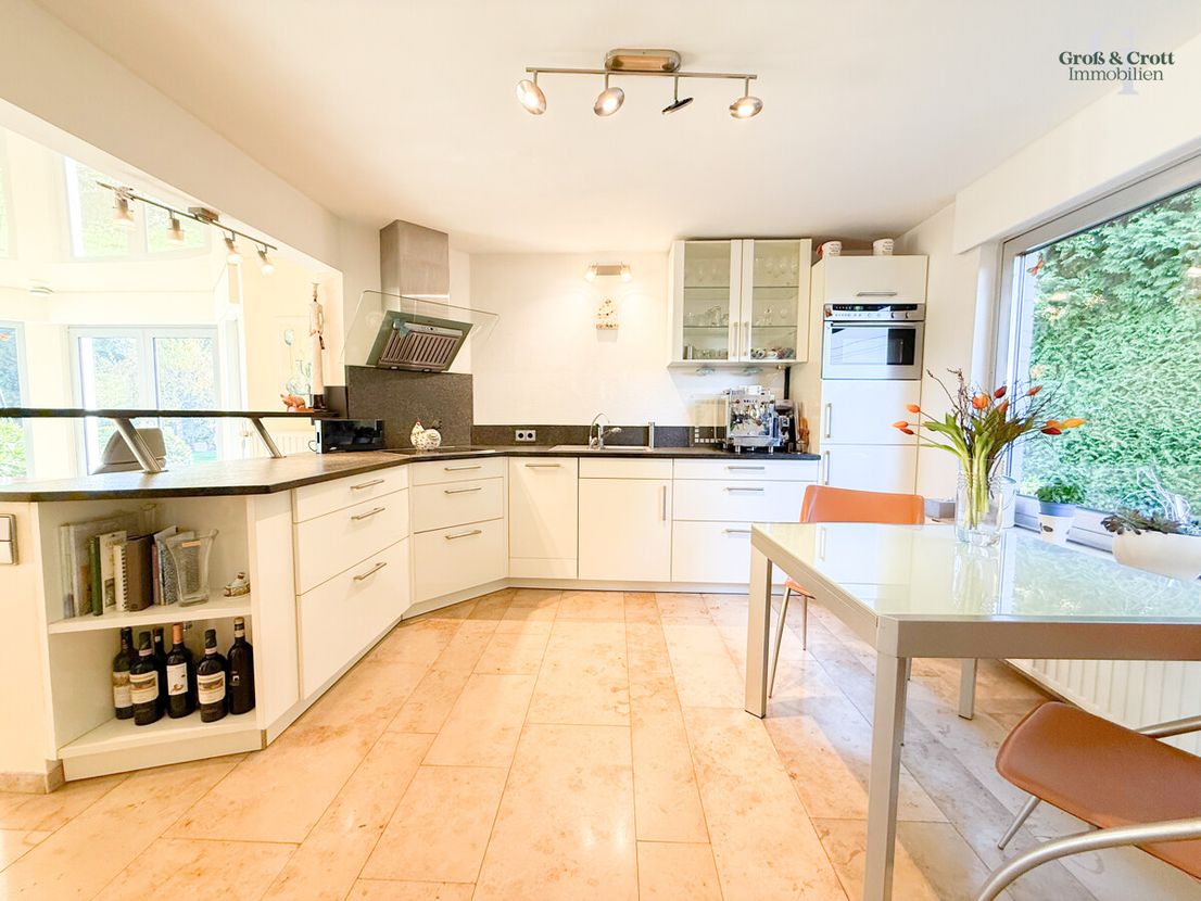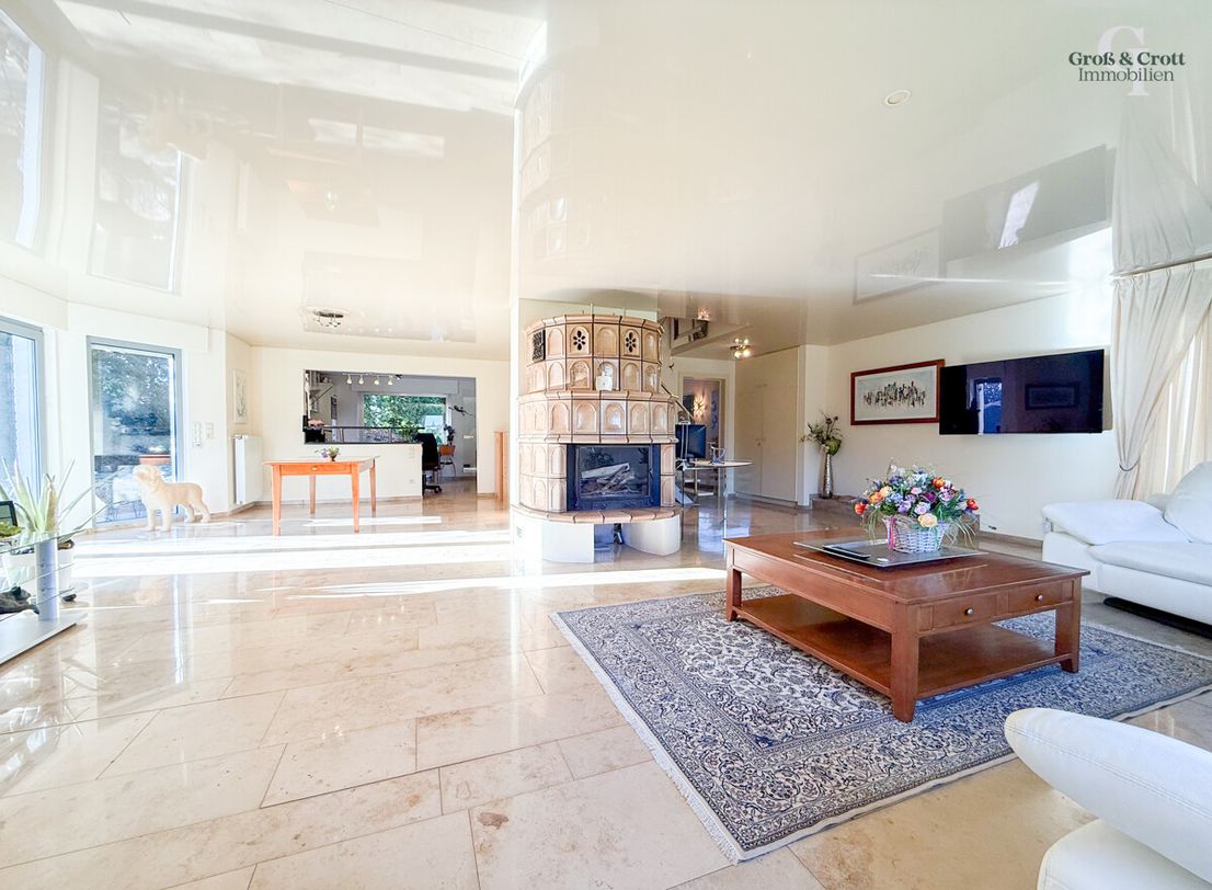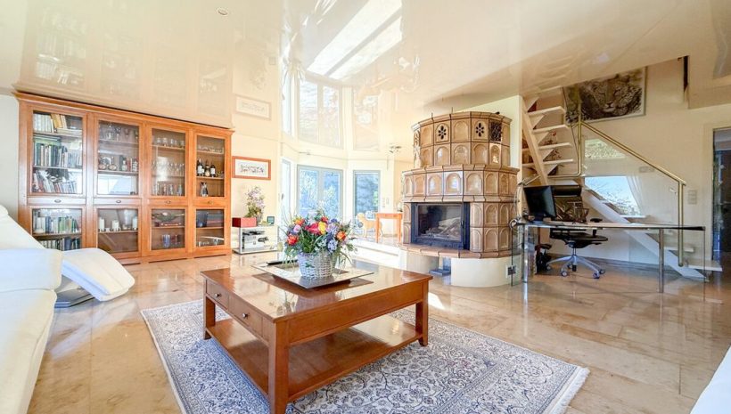 Im EG sorgen ein luxuriöser Marmorboden sowie große, lichtdurchflutete Räume für eine elegante Atmosphäre. Das Wohnzimmer beeindruckt mit einem großzügigen Kamin mit einsehbarer Brennkammer und langanhaltender Wärmeausstrahlung, der für besonders gemütliche Stunden sorgt. Die hochwertige Einbauküche der Marke LEICHT ist mit einer Granitarbeitsplatte sowie einem integrierten Wasserfiltersystem ausgestattet und verbindet modernes Design mit höchster Funktionalität. Das Badezimmer und das Gäste-WC sind mit edlen Sanitäranlagen versehen.