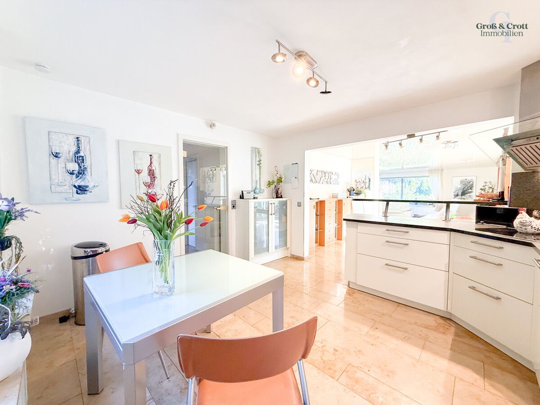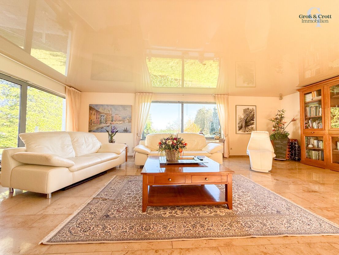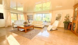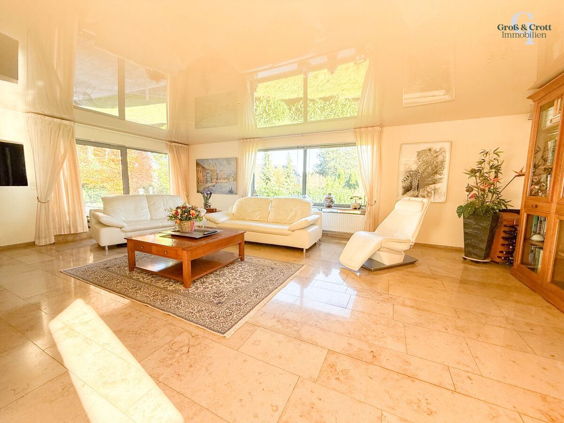Im EG sorgen ein luxuriöser Marmorboden sowie große, lichtdurchflutete Räume für eine elegante Atmosphäre. Das Wohnzimmer beeindruckt mit einem großzügigen Kamin mit einsehbarer Brennkammer und langanhaltender Wärmeausstrahlung, der für besonders gemütliche Stunden sorgt. Die hochwertige Einbauküche der Marke LEICHT ist mit einer Granitarbeitsplatte sowie einem integrierten Wasserfiltersystem ausgestattet und verbindet modernes Design mit höchster Funktionalität. Das Badezimmer und das Gäste-WC sind mit edlen Sanitäranlagen versehen.