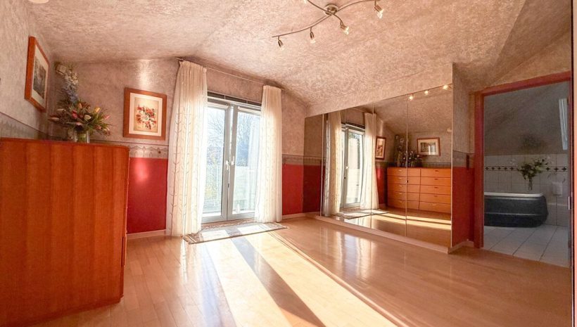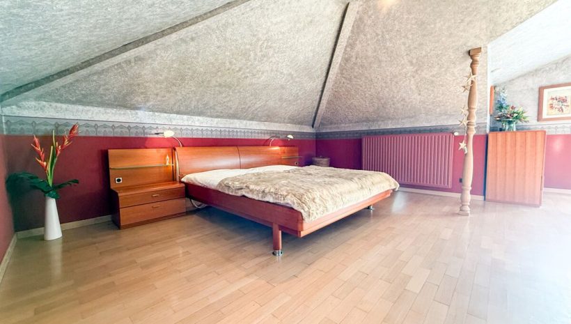 Das OG verfügt über ein geräumiges Schlafzimmer mit Ankleidebereich, das mit Parkettboden gestaltet ist. Die Ankleide ist mit hochwertigen Einbauschränken ausgestattet und bietet reichlich Stauraum. Ein kleiner Balkon erweitert den privaten Rückzugsbereich und bietet Blick in den tollen Garten.