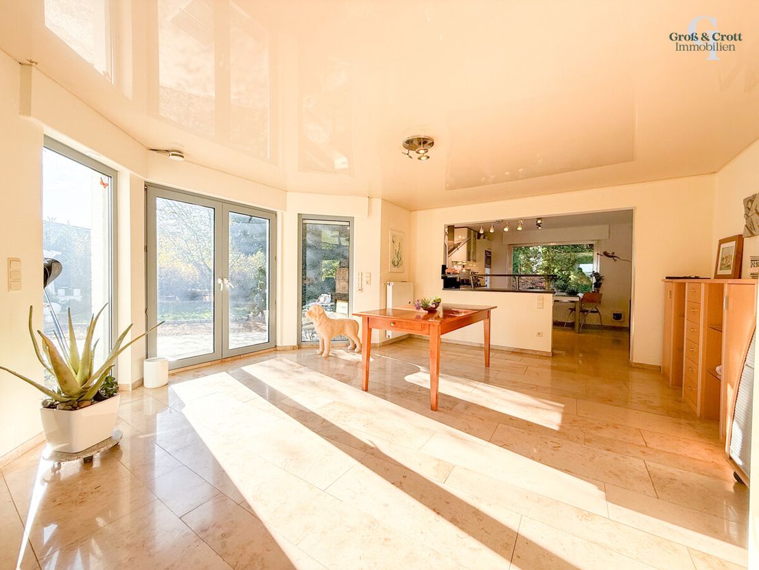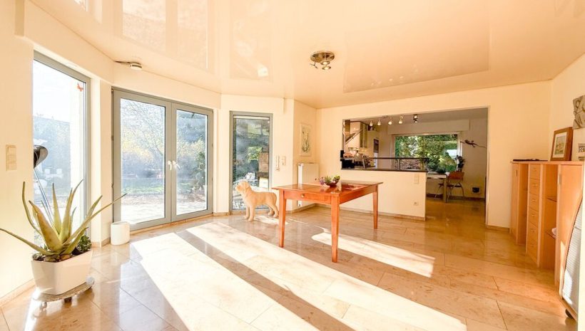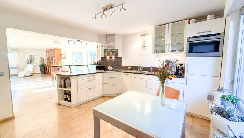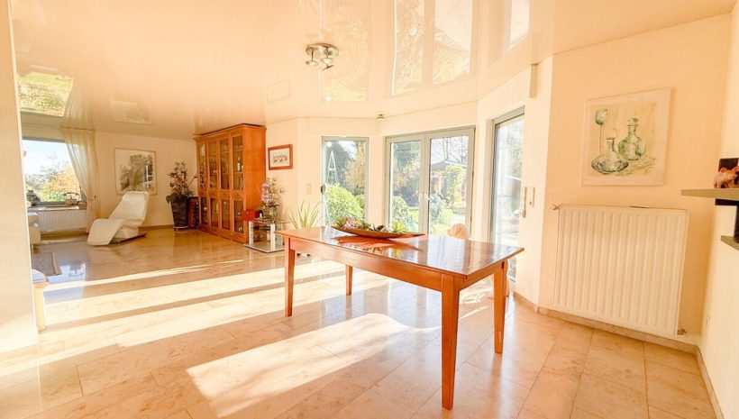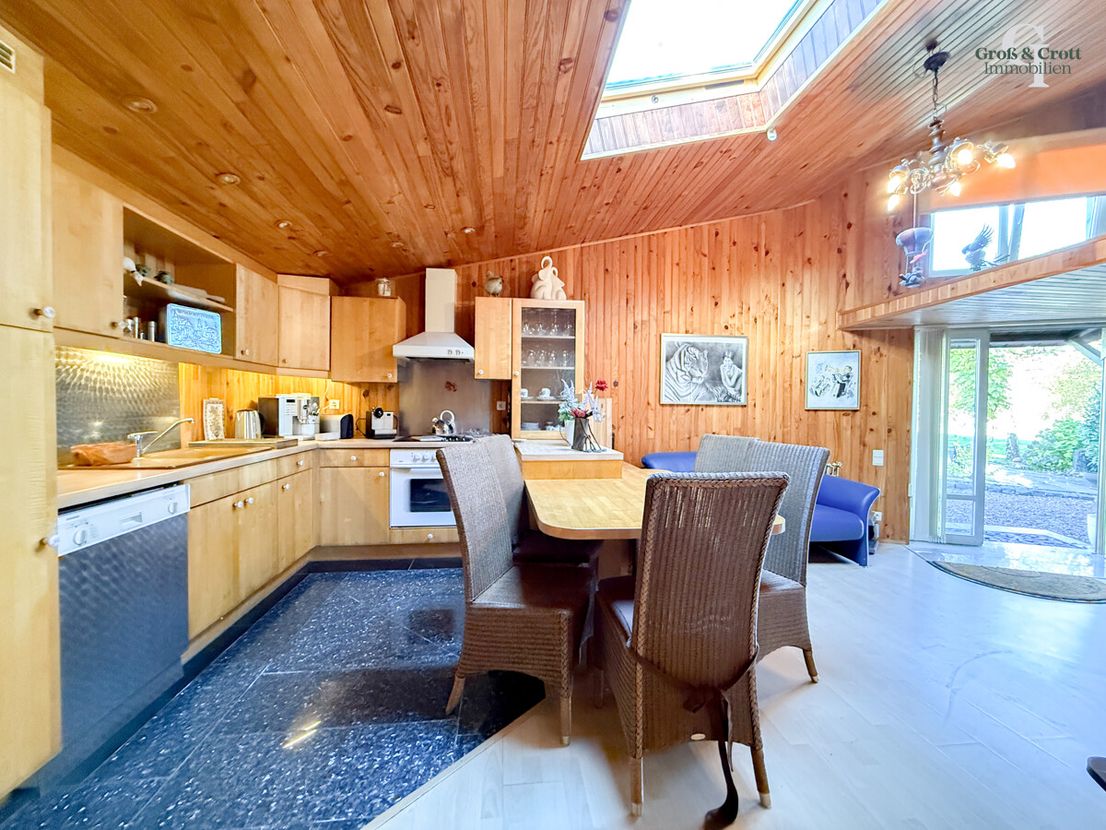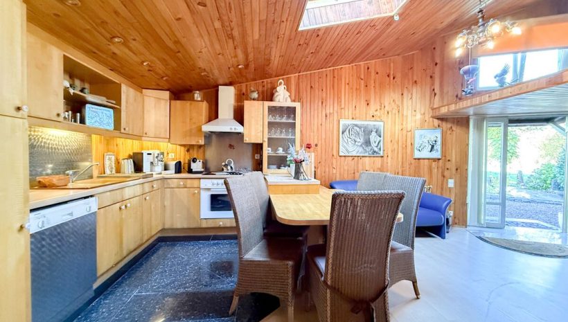 Der Bungalow selbst beeindruckt durch eine großzügige, moderne Raumstruktur. Im EG empfängt Sie ein außergewöhnlich großes, lichtdurchflutetes Wohnzimmer mit Kamin, das durch große Fensterfronten einen herrlichen Blick ins Grün sowie viel Helligkeit bietet. Angrenzend befinden sich das Esszimmer und die offene Küche, die den Wohnbereich zu einem harmonischen, einladenden Mittelpunkt des Hauses verbinden. Da die Immobilie bislang von nur zwei Personen bewohnt wurde, wurde das ursprünglich zweite Schlafzimmer im EG zugunsten einer großzügigen offenen Küchenlösung umgebaut – diese Änderung kann auf Wunsch problemlos rückgängig gemacht werden, falls ein zusätzliches Schlafzimmer benötigt wird. Ein Gäste-WC rundet das Raumangebot auf dieser Ebene ab.