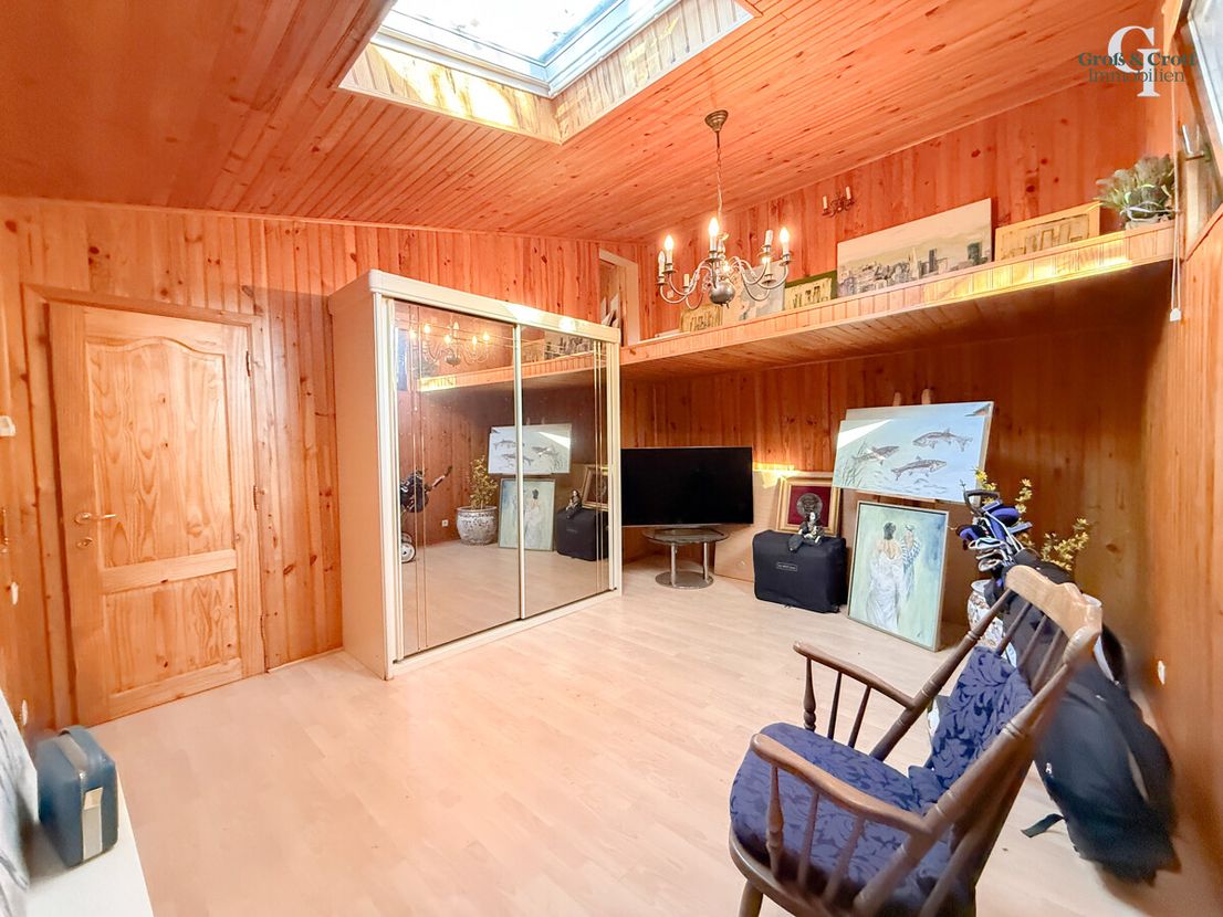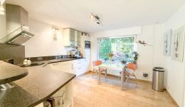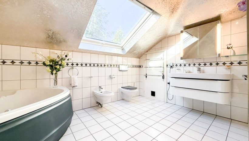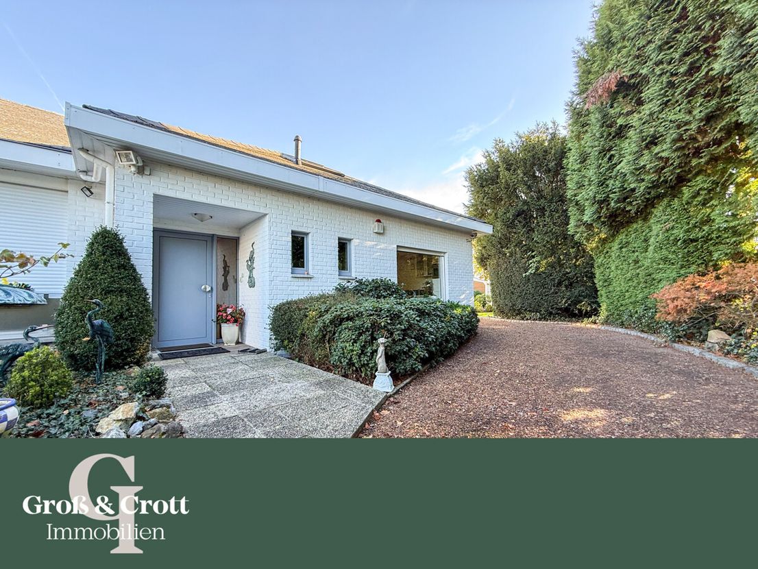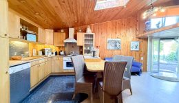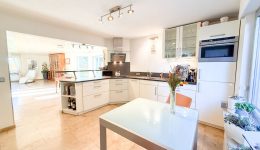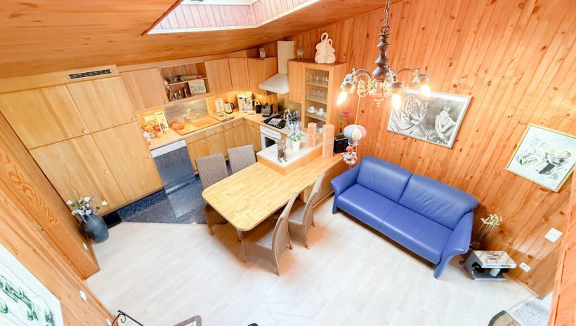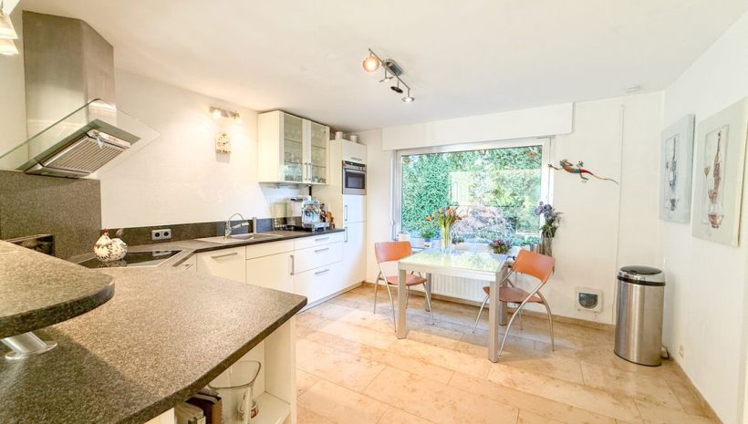 Der Bungalow selbst beeindruckt durch eine großzügige, moderne Raumstruktur. Im EG empfängt Sie ein außergewöhnlich großes, lichtdurchflutetes Wohnzimmer mit Kamin, das durch große Fensterfronten einen herrlichen Blick ins Grün sowie viel Helligkeit bietet. Angrenzend befinden sich das Esszimmer und die offene Küche, die den Wohnbereich zu einem harmonischen, einladenden Mittelpunkt des Hauses verbinden. Da die Immobilie bislang von nur zwei Personen bewohnt wurde, wurde das ursprünglich zweite Schlafzimmer im EG zugunsten einer großzügigen offenen Küchenlösung umgebaut – diese Änderung kann auf Wunsch problemlos rückgängig gemacht werden, falls ein zusätzliches Schlafzimmer benötigt wird. Ein Gäste-WC rundet das Raumangebot auf dieser Ebene ab.