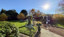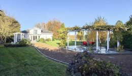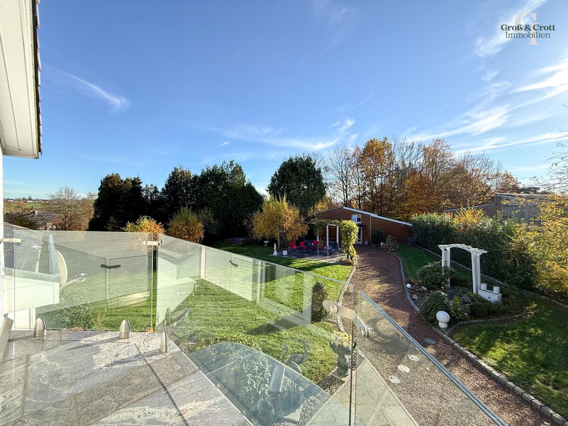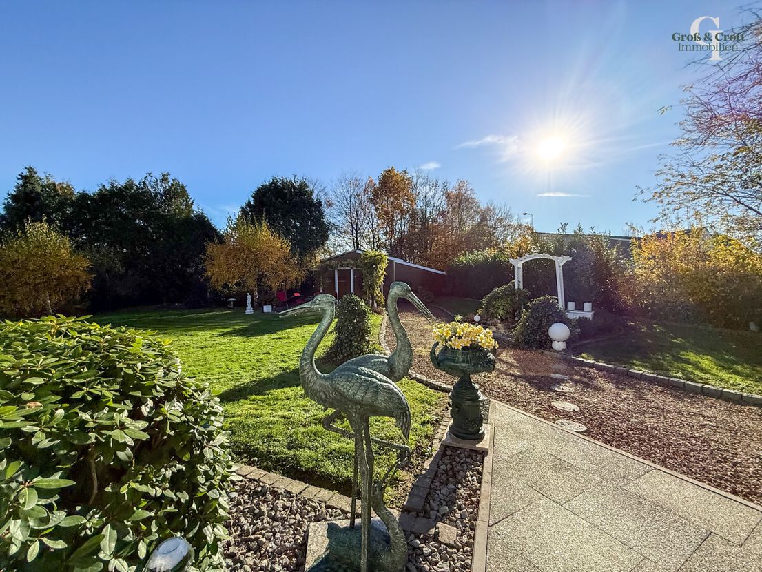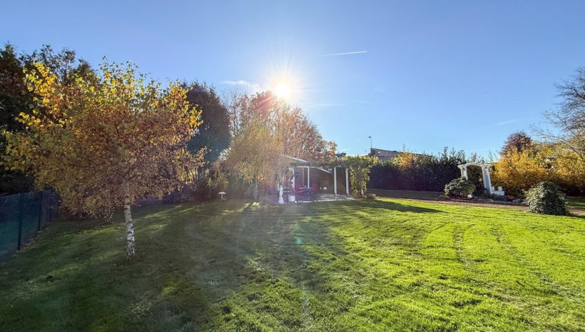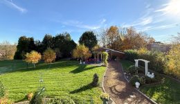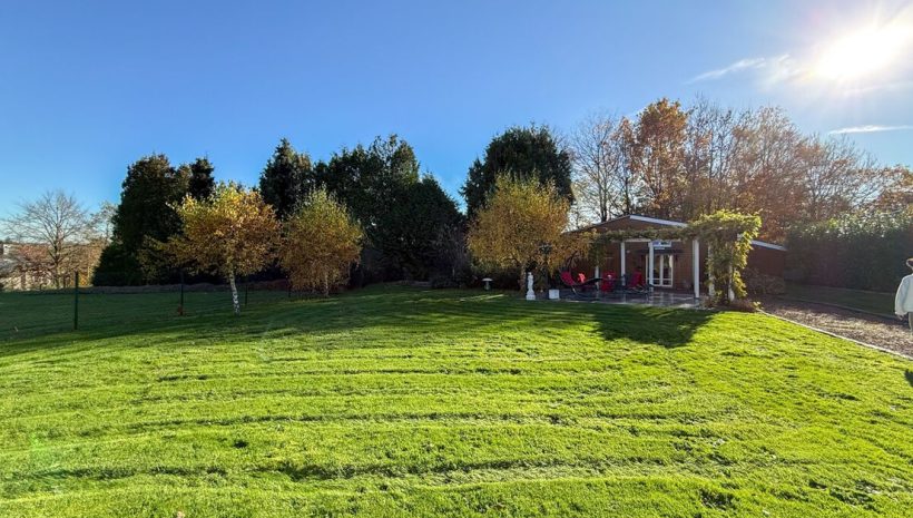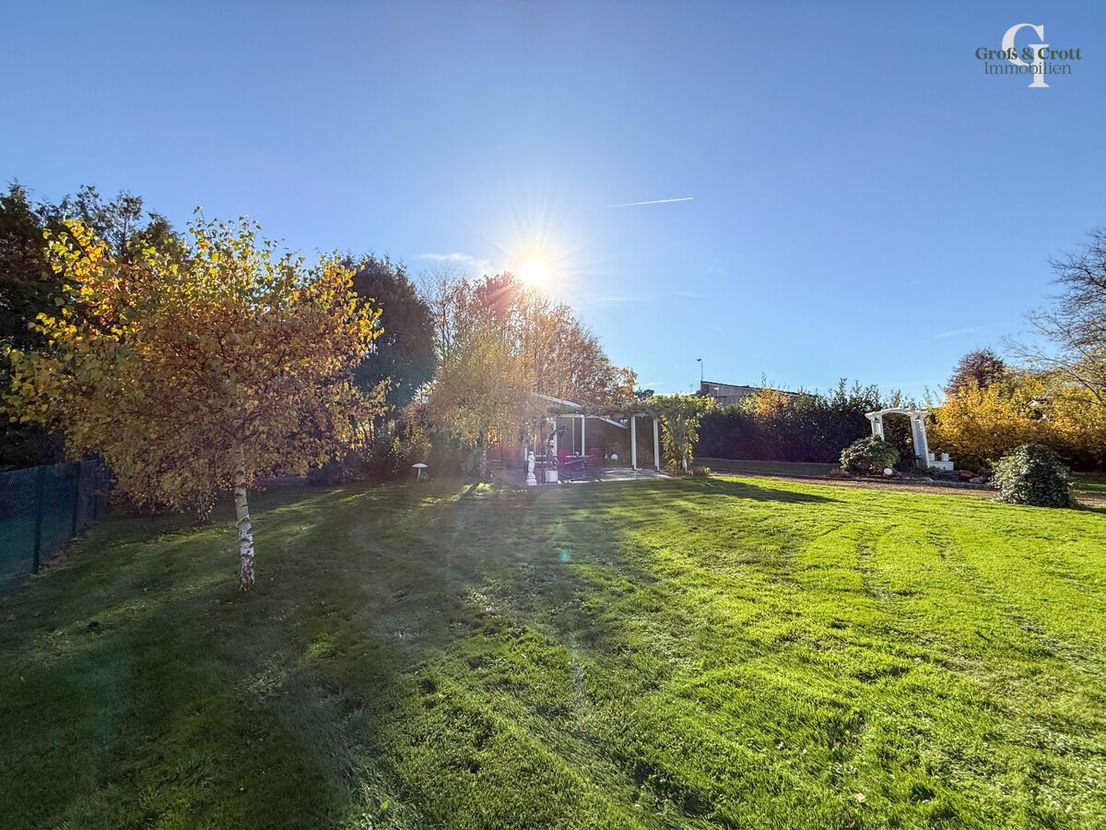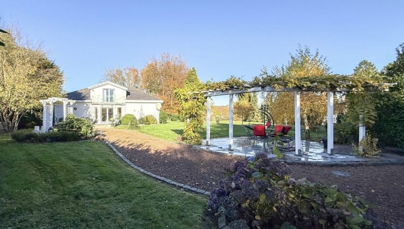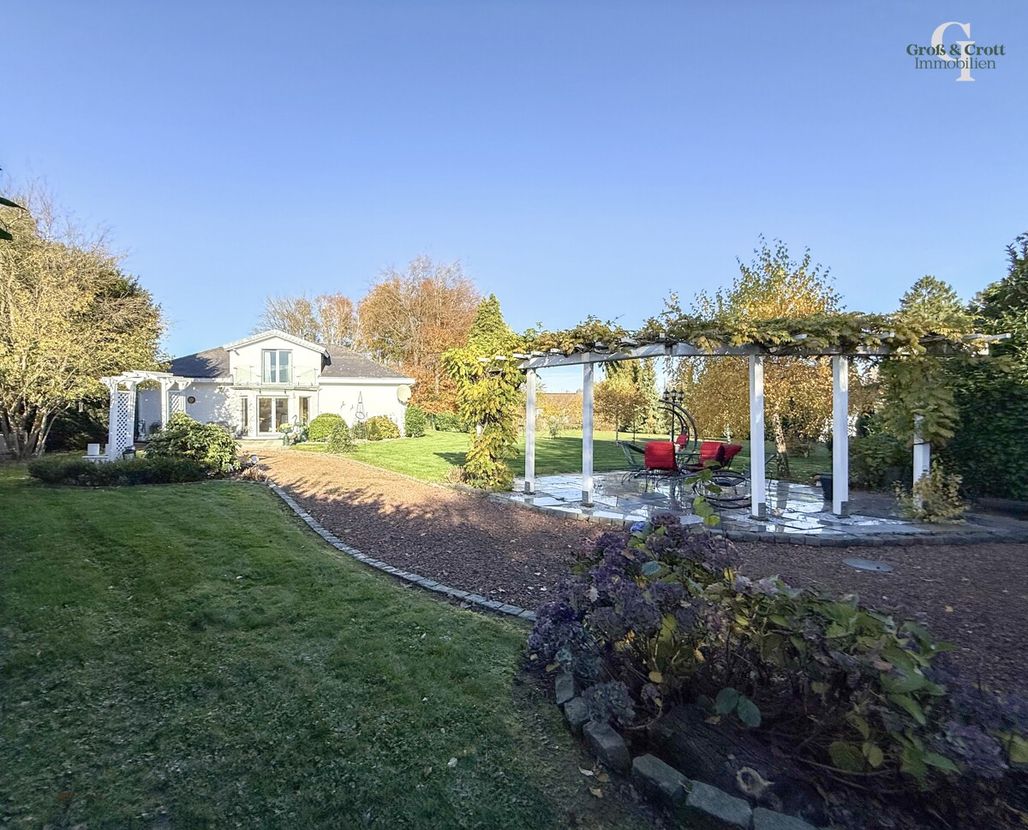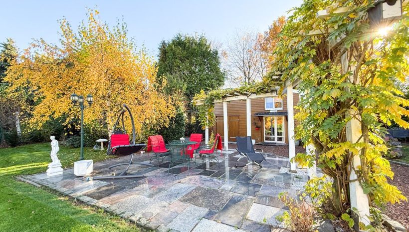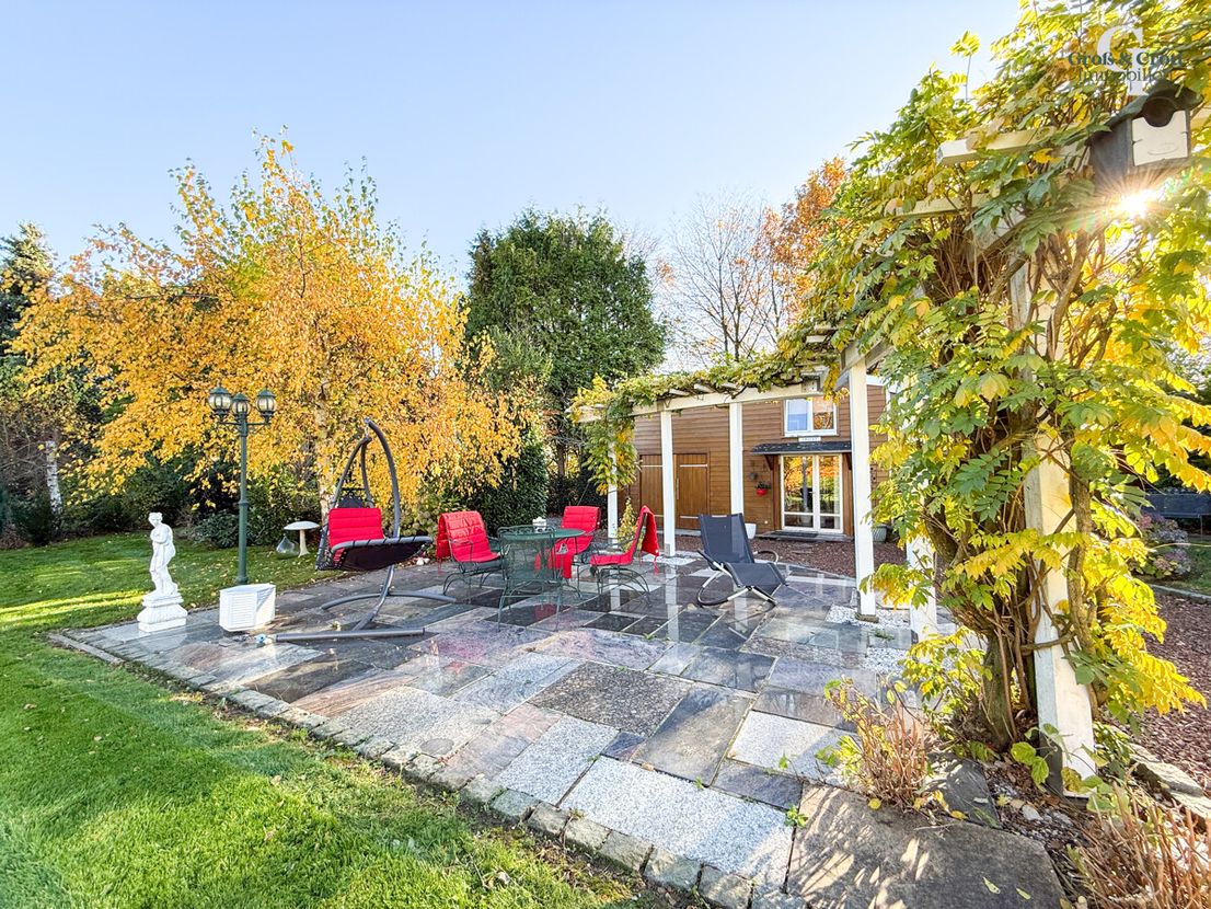 Der weitläufige Garten mit gepflegten Grünflächen und toller Bepflanzung schafft eine idyllische, parkähnliche Atmosphäre. Zwei wunderschöne Terrassen laden zu entspannten Stunden im Freien ein: eine direkt am Haus mit Zugang vom Wohnzimmer – ideal für den Morgenkaffee oder gesellige Abende – sowie eine weitere Terrasse mitten im Garten. Letztere wurde als Naturstein-Terrasse mit einer stimmungsvollen Pergola gestaltet und bietet einen besonders charmanten Rückzugsort.