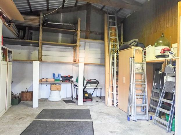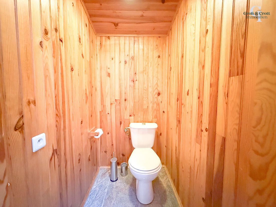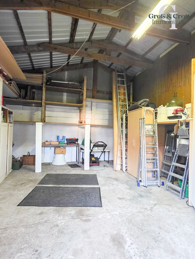 Im hinteren Bereich des Grundstücks steht das separate Gästehaus, das über ein Wohnzimmer mit offener Küche, ein Schlafzimmer mit Empore sowie ein Badezimmer und WC verfügt. Angrenzend befindet sich eine Werkstatt/Lagerhalle, die zusätzliche Nutzungsmöglichkeiten bietet. Das Dach des Gästehauses wurde vor ca. 10 Jahren erneuert.