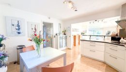 Als funktionale Schaltzentrale des Haushalts präsentiert sich der Hauswirtschaftsraum, der direkt an die Küche angrenzt und über integrierte Küchenelemente wie Kühl-/Gefrierschrank und Spülbecken verfügt.