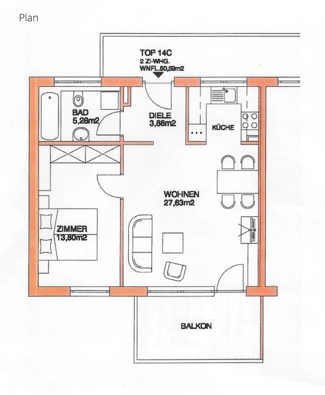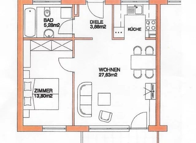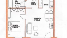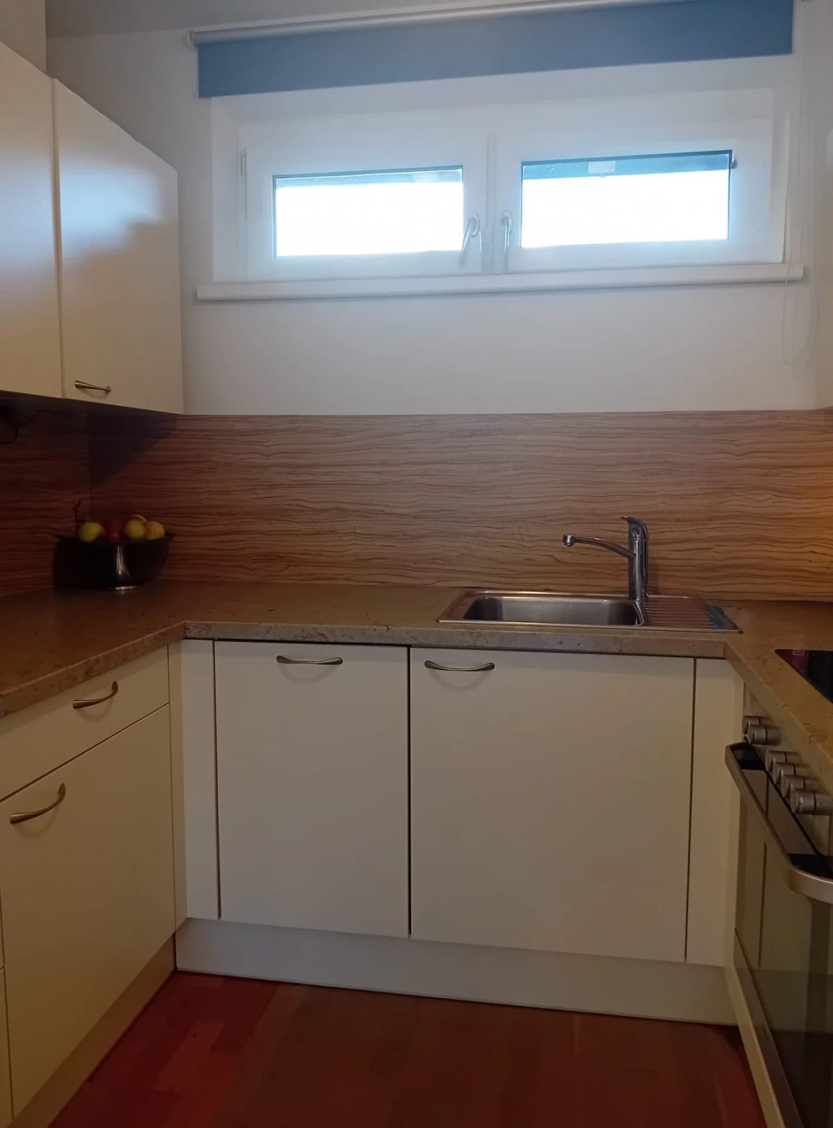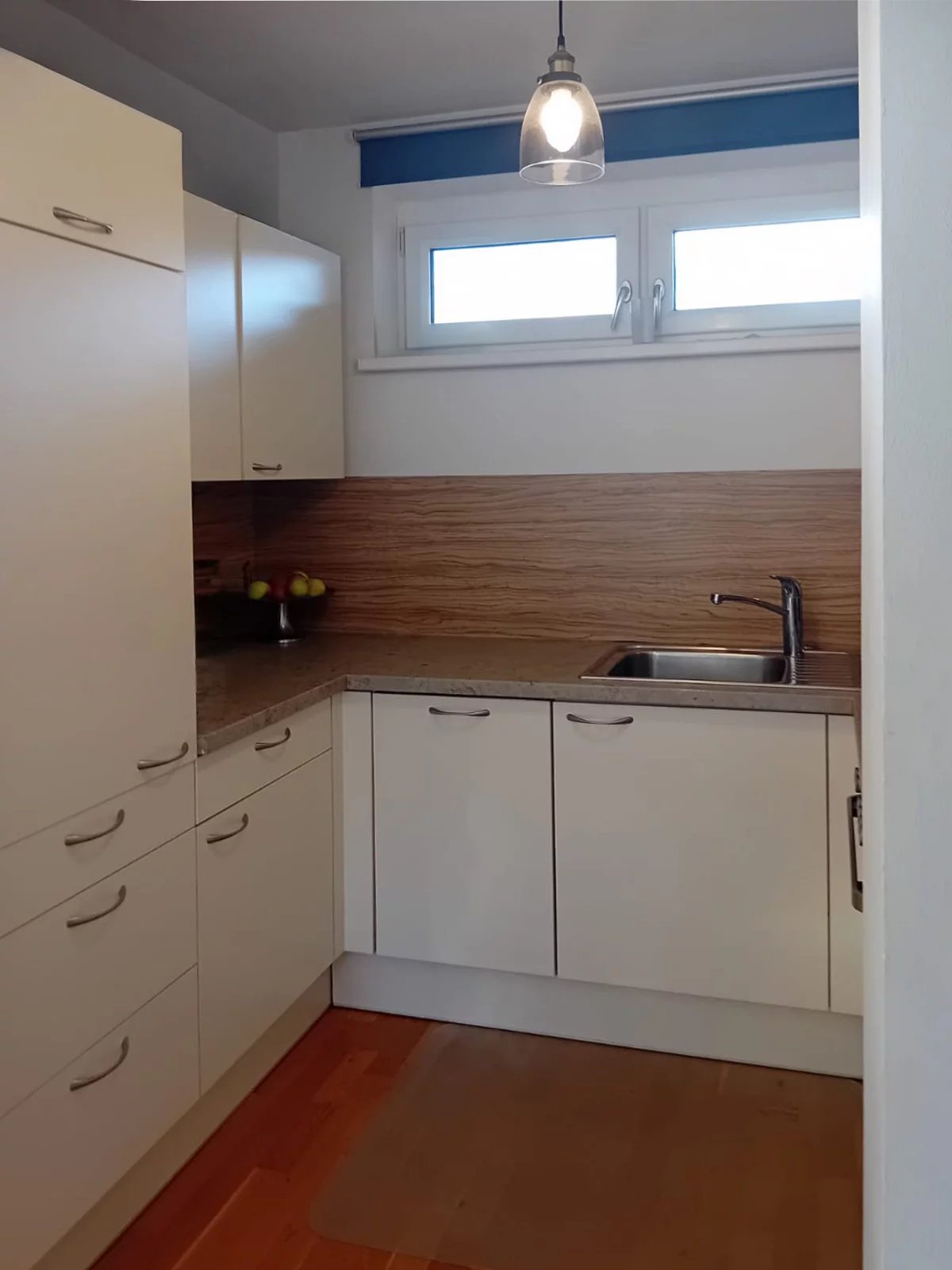 Die Raumaufteilung ist durchdacht und komfortabel. Über die ca. 4 m² große Eingangsdiele gelangen Sie in den großzügigen Wohn- und Essbereich mit rund 28 m², der sich wunderbar als zentraler Lebensraum gestalten lässt. Die zum Wohnbereich hin halboffene Küche ist mit einer modernen, zeitlos gestalteten Einbauküche ausgestattet und fügt sich harmonisch in den Raum ein – ideal für gesellige Abende oder entspannte Urlaubstage. Vom Wohnbereich aus erreichen Sie direkt den Balkon, der den Wohnraum im Sommer nahezu erweitert. Das Schlafzimmer mit ca. 14 m² ist ruhig gelegen und bietet beste Voraussetzungen für erholsame Nächte, begleitet von der Stille der Berge. Das Badezimmer ist hell und sauber gefliest, verfügt über ein Fenster, eine Badewanne, ein Waschbecken, ein Hänge-WC sowie einen Waschmaschinenanschluss und rundet das stimmige Wohnkonzept ab.
