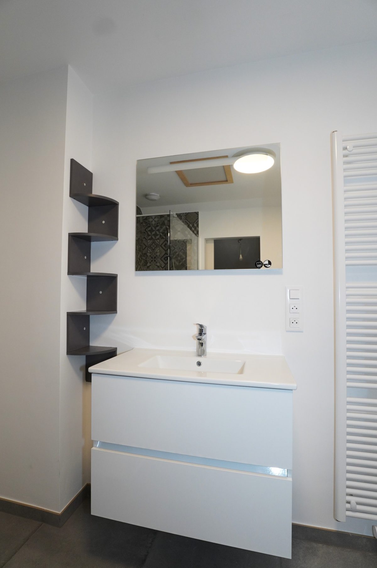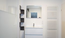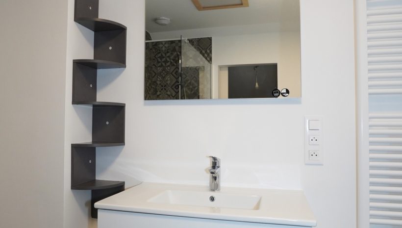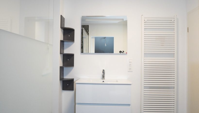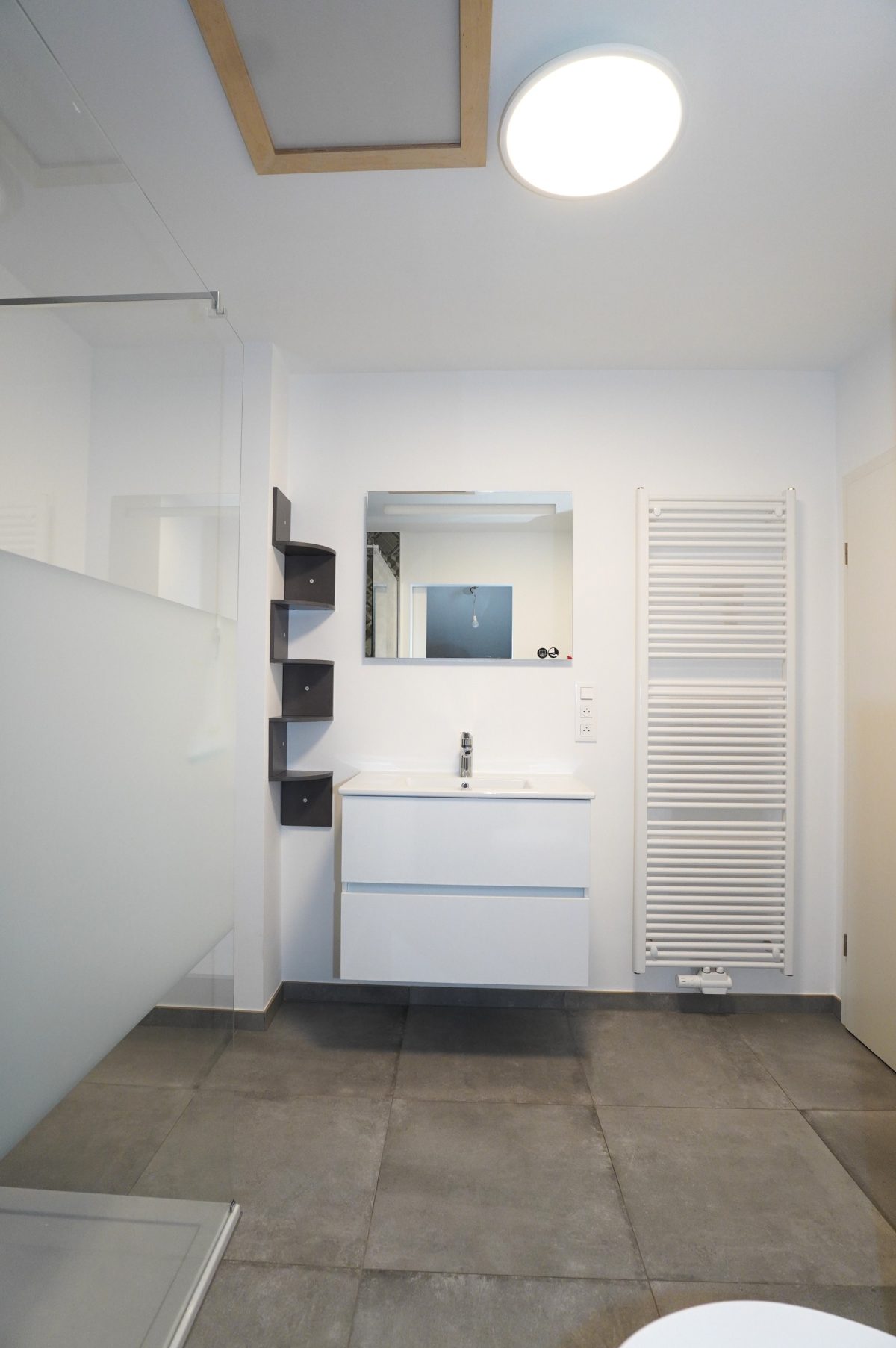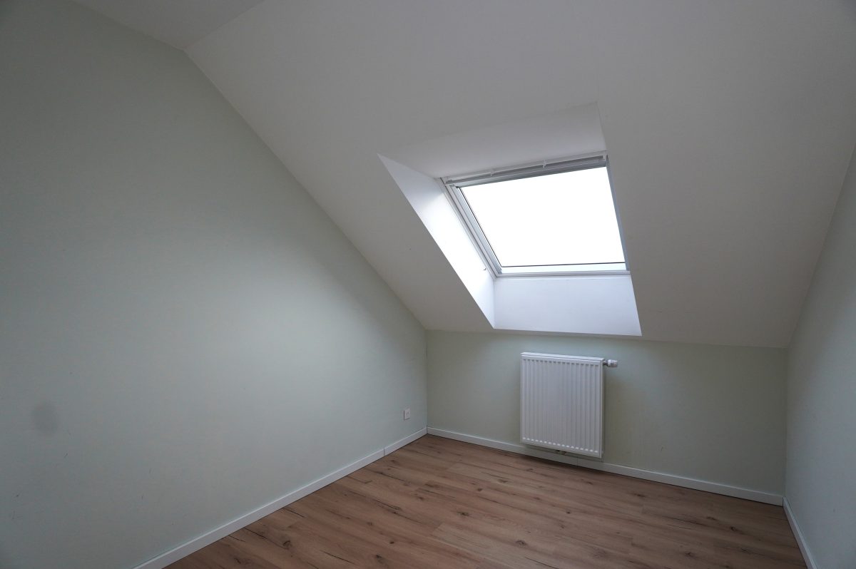Die Wohnung verfügt über zwei Schlafzimmer. Am Ende des Flurs befindet sich das geschmackvoll gestaltete Badezimmer mit begehbarer Dusche, modernen Waschbeckenmöbeln und WC. Angrenzend liegt der praktische Hauswirtschaftsraum, ausgestattet mit der zentralen Gasheizung und den Anschlüssen für eine Waschmaschine.