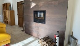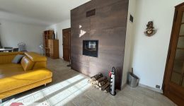Das Erdgeschoss des Duplex empfängt mit einer großzügigen Eingangshalle, die den hochwertigen Charakter der Immobilie sofort spürbar macht. Natursteinplatten, maßgefertigte Holzarbeiten, ein integrierter Einbauschrank und die eindrucksvolle Treppe aus massivem Holz sorgen für einen stilvollen ersten Eindruck. Von hier aus erschließen sich ein Gäste-WC sowie eine funktionale Waschküche. Der ca. 50 m² große Wohnbereich, lichtdurchflutet dank großer Fensterfronten, bietet einen fließenden Übergang zur Terrasse und zum Außenbereich. Dieser großzügige Raum eignet sich gleichermaßen für gesellige Momente wie für entspannte Stunden – zu jeder Jahreszeit. Ein mit Cortenstahl verkleideter Holzofen unterstreicht die warme, zeitgemäße Atmosphäre und sorgt für zusätzlichen Wohnkomfort.