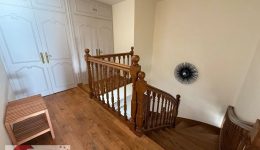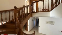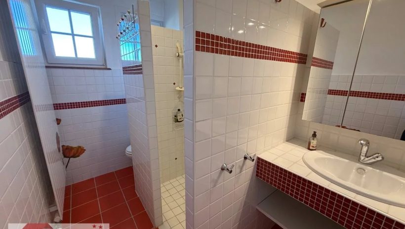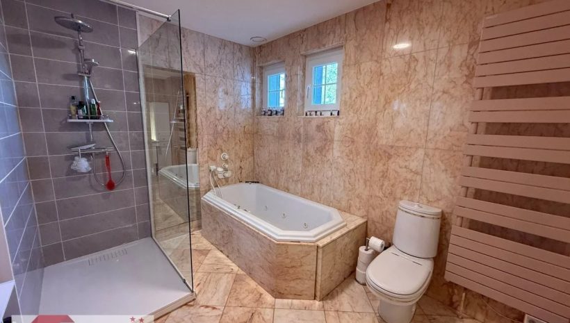 Das Obergeschoss, erreichbar über die eindrucksvolle Massivholztreppe, beherbergt den Schlafbereich mit vier Schlafzimmern und einem Flurbereich. Alle Schlafzimmer sind mit Massivholzparkett und charaktervollen Türen ausgestattet und bieten angenehme Raumgrößen sowie eine behagliche Atmosphäre. Das Hauptbadezimmer aus Marmor verfügt über hochwertige Ausstattungen wie eine bodengleiche Dusche, eine Whirlpool-Wanne, ein Doppelwaschbecken und ein WC. Ein zusätzliches Duschbad ergänzt diese Etage und erfüllt die Anforderungen einer Familie oder von Gästen in idealer Weise.