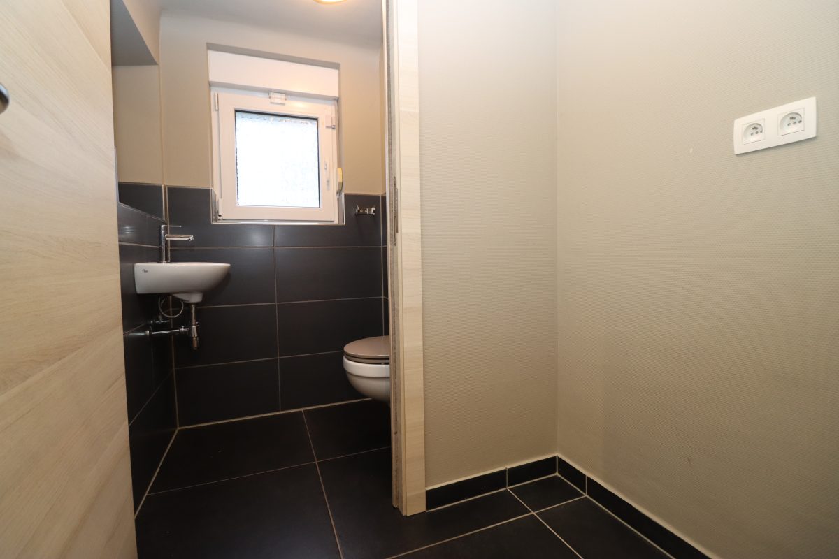 Das helle Wohnzimmer befindet sich in einem Neubau aus dem Jahr 2013 und überzeugt durch seine moderne Gestaltung sowie eine elektrische Lichtkuppel, die für viel Tageslicht sorgt. Ergänzt wird das Erdgeschoss durch ein praktisches Gäste-WC.
