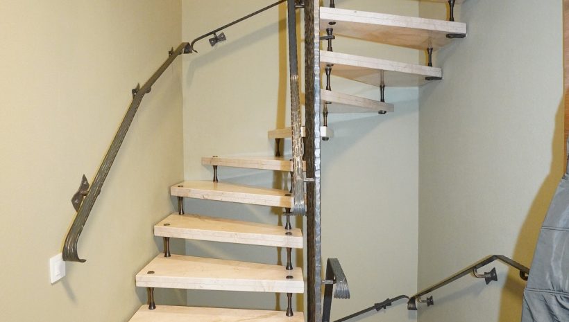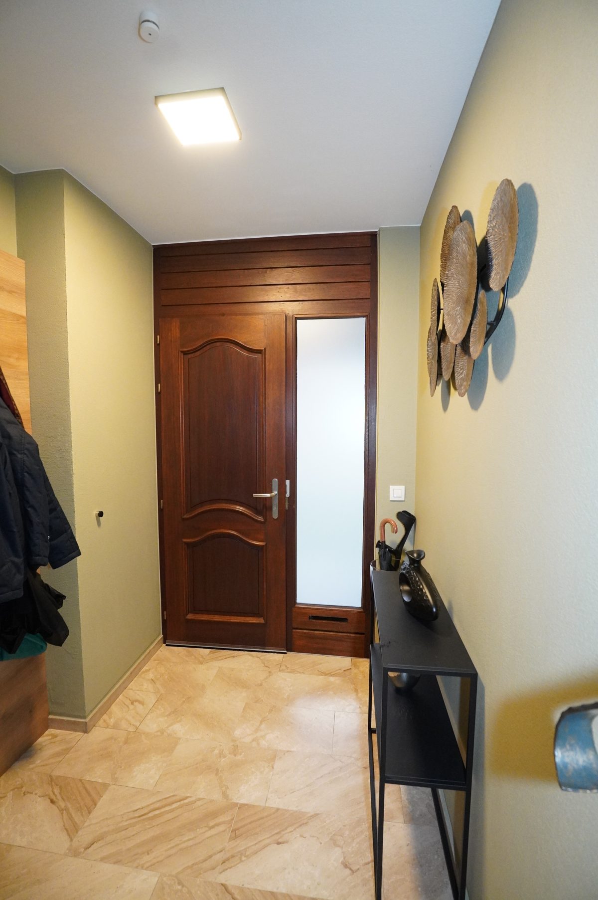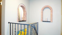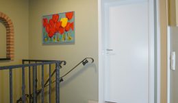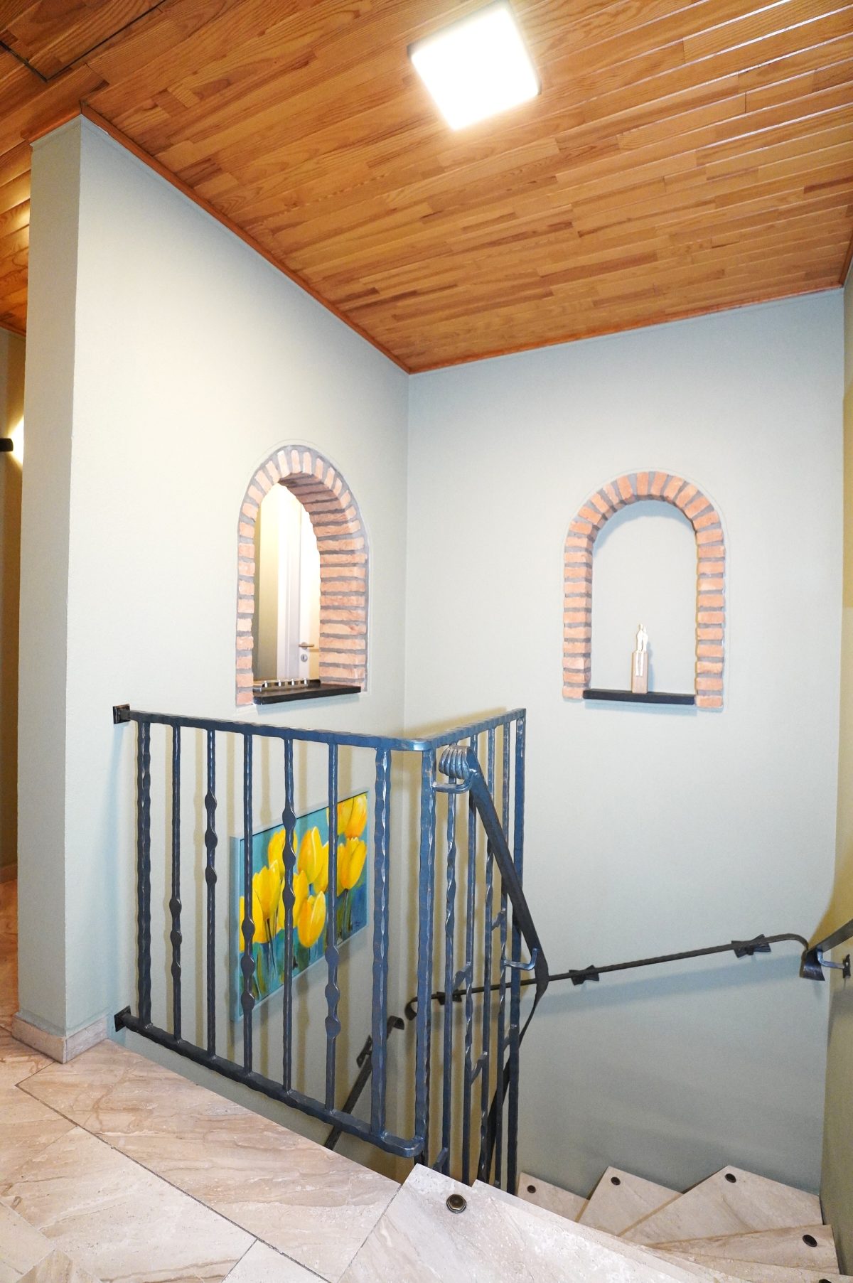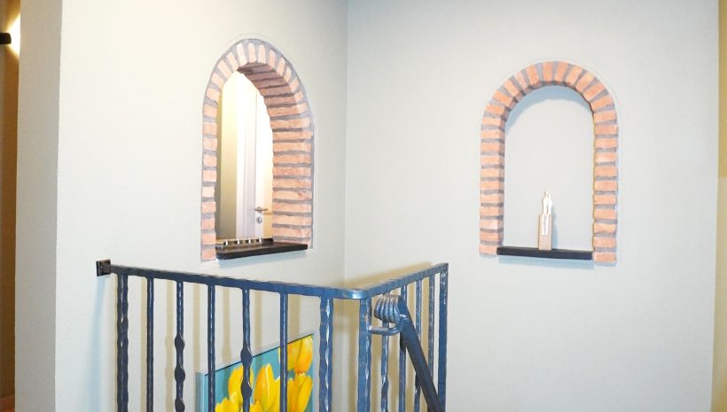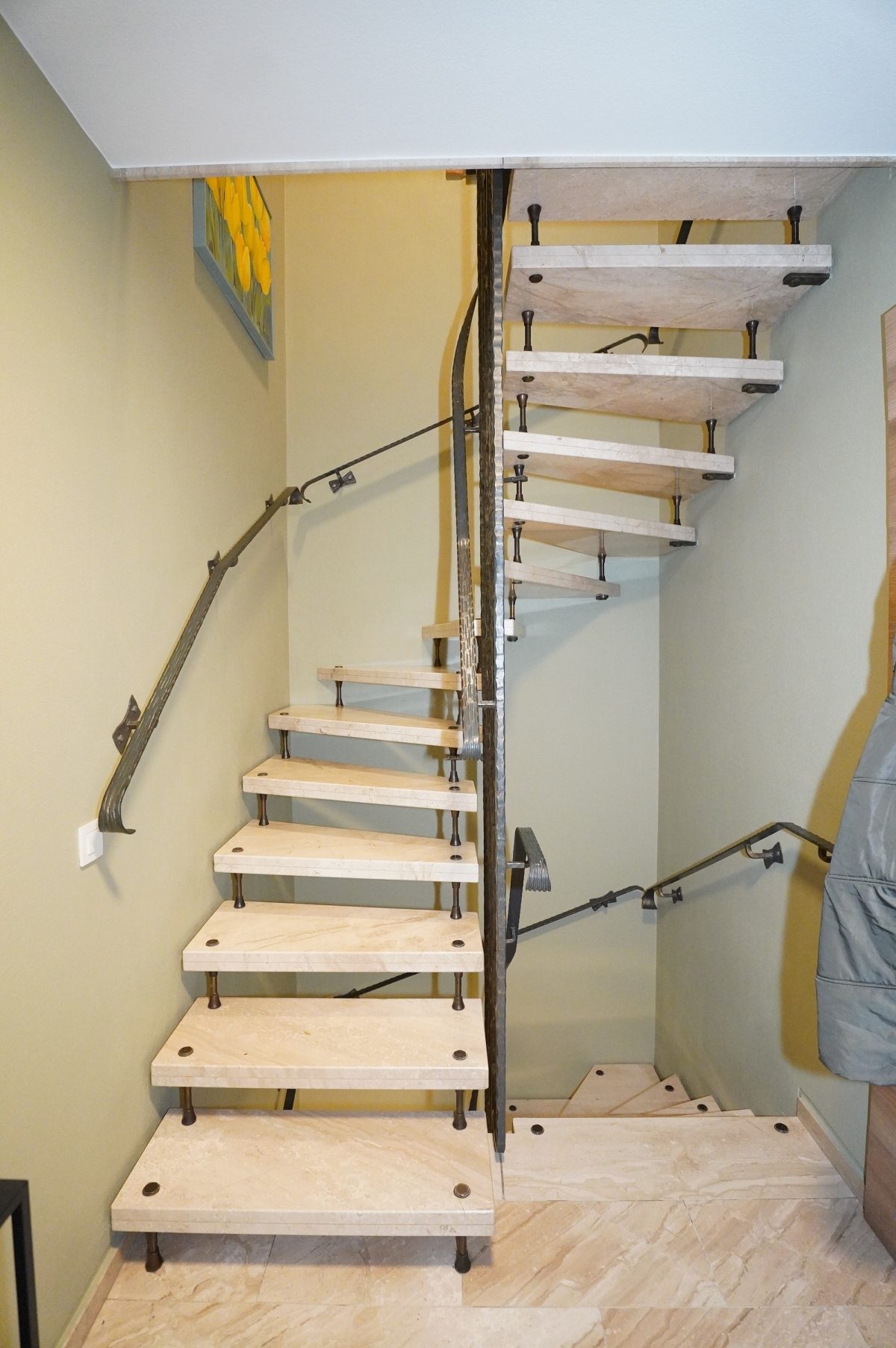 Der Zugang zur Wohnung erfolgt über ein elegantes Treppenhaus mit schmiedeeisernem Geländer und Natursteinen, das sowohl zu den Wohnräumen im ersten Stock als auch zum Keller (rückseitiges Erdgeschoss) führt.