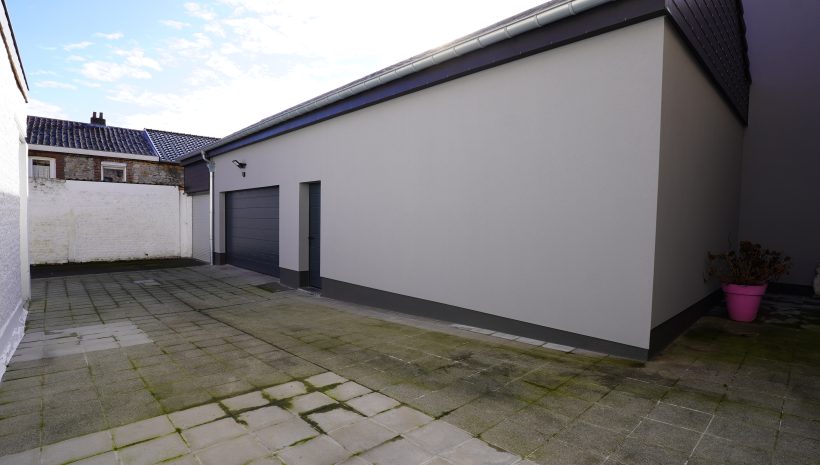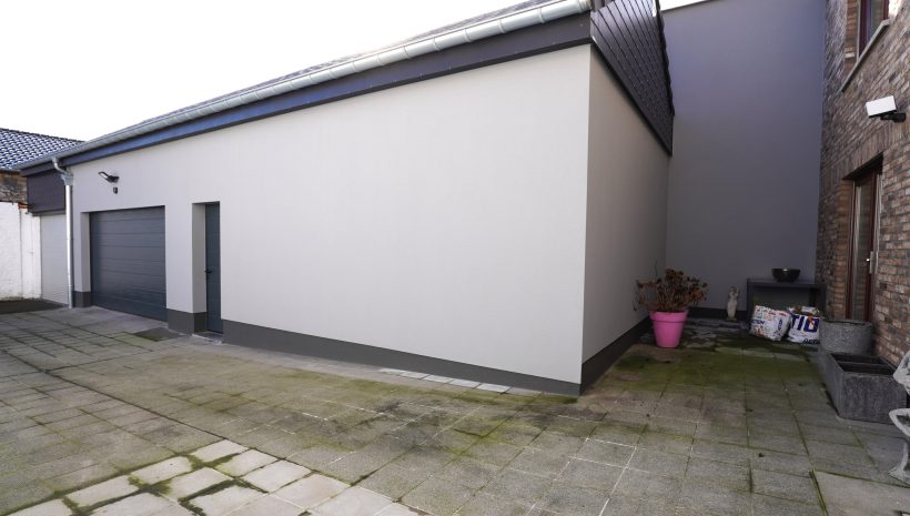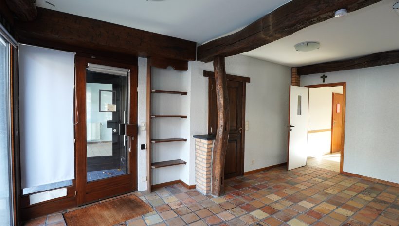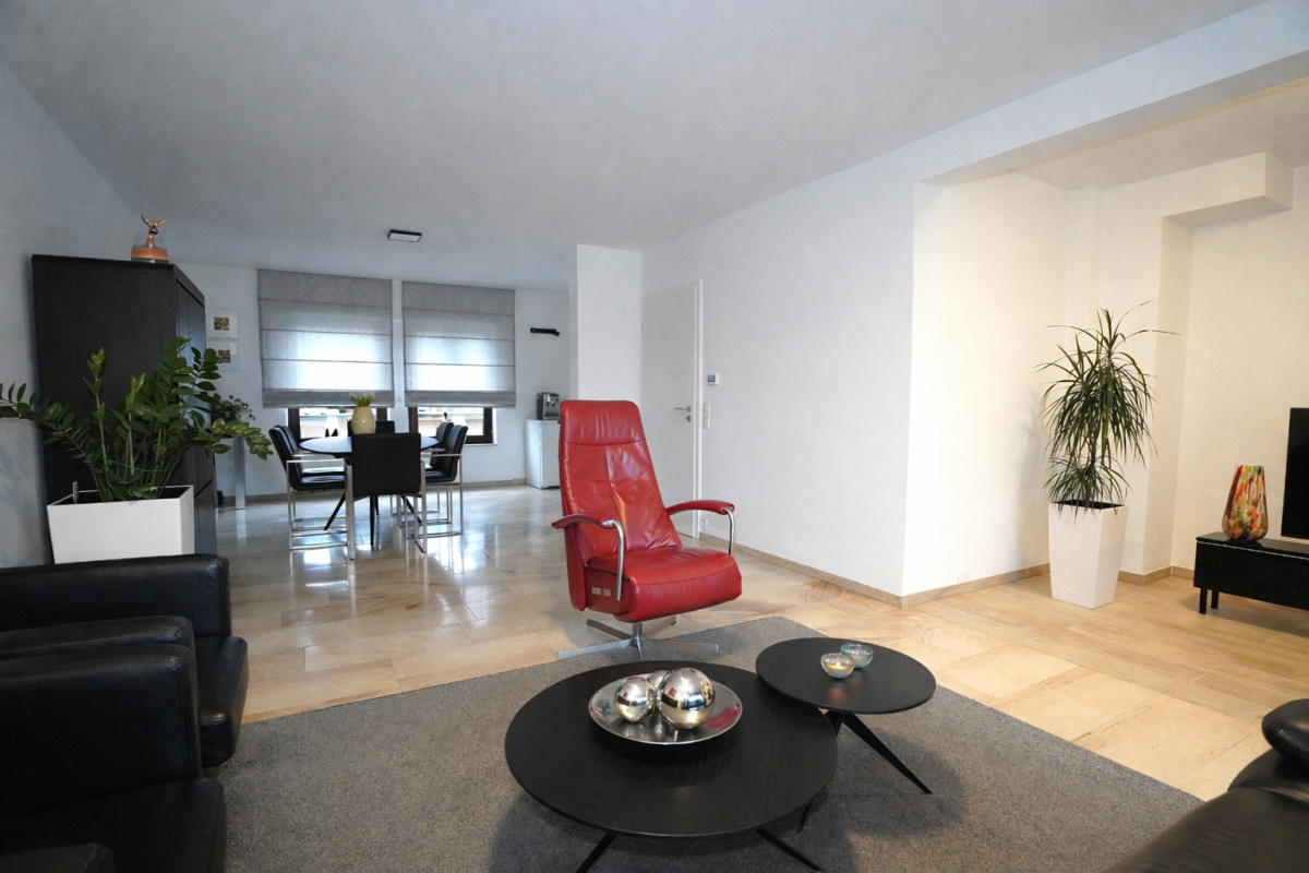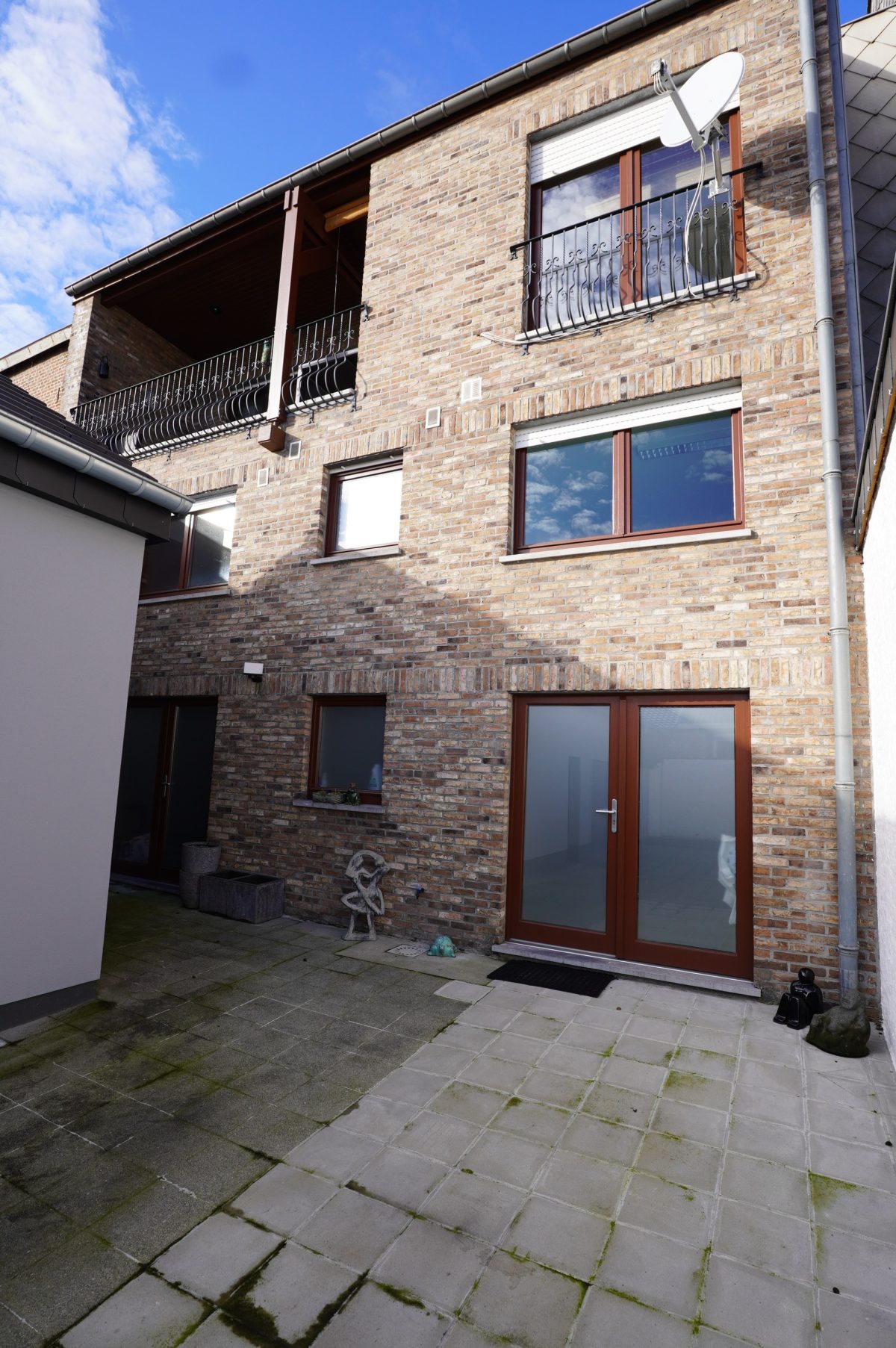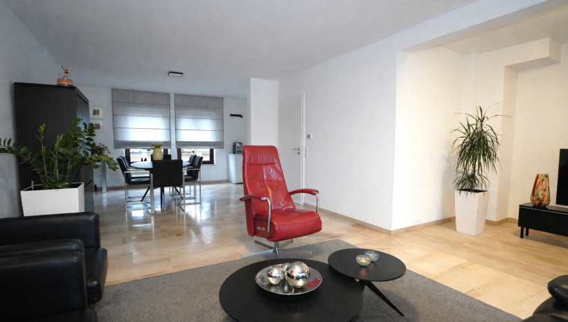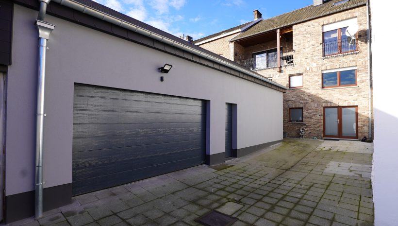 Wunderschönes, perfekt gepflegtes Wohn-/Gewerbegebäude bestehend aus zwei Gewerbeflächen im Erdgeschoss, einer hervorragend und vollständig renovierten Wohnung mit Terrassen sowie einer großen Garage, gelegen im Herzen des Dorfes Gemmenich, Rue César Franck 5–7.