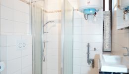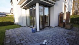Die Wohnung verfügt über einen Eingangsbereich mit maßgefertigtem Garderobenschrank, ein Schlafzimmer mit Einbauschrank, ein Duschbad mit Dusche, Waschbecken, WC und Anschluss für eine Waschmaschine sowie einen hellen, geräumigen Wohnbereich mit offener, voll ausgestatteter Küche. Vom Wohnzimmer aus Zugang zur sonnigen Terrasse mit kleinem Garten. Die Terrasse kann bei Bedarf mit einer Markise überdacht werden.