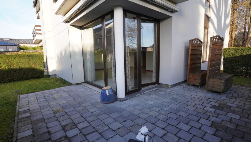 Helle Wohnung im Erdgeschoss eines kleinen Wohnobjekts, nahe dem Zentrum von Montzen, gelegen in der Rue Gustave Demoulin 21/1, 4850 Montzen, mit Garten und Garage.