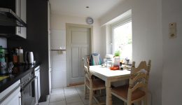 Die Küche bietet sowohl Zugang zum Außenbereich als auch zum Hauswirtschaftsraum, der zusätzlich mit einer Dusche sowie Anschlüssen für eine Waschmaschine versehen ist.