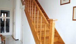 Die Immobilie verfügt über einen hellen Eingangsbereich mit ansprechendem Holztreppenhaus, das die einzelnen Etagen miteinander verbindet, sowie ein separates WC, ein Büro und einen großzügigen Wohnbereich mit offenem Übergang zum Esszimmer und direktem Zugang zur voll ausgestatteten Küche.