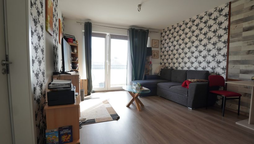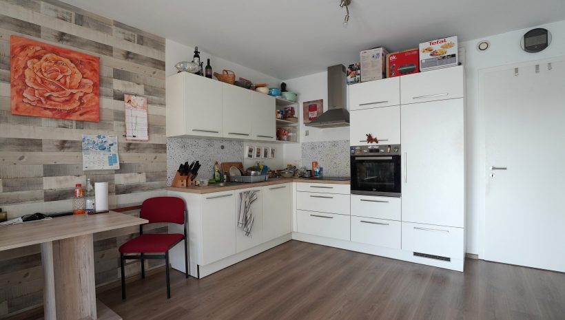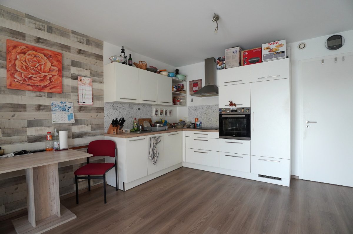 Eingangsbereich, großes und lichtdurchflutetes Wohnzimmer mit schöner Einbauküche und Zugang zum Balkon, ein Schlafzimmer, eine Waschküche/Abstellraum, ein Badezimmer mit Waschtisch, Badewanne und WC sowie ein Ankleidezimmer oder Büro.