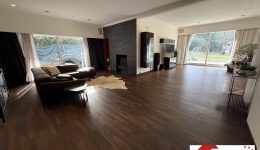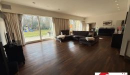 Der Hauptwohnbereich mit warmen Parkettboden erstreckt sich über insgesamt etwa 118 m² und gliedert sich in ein behagliches Kaminzimmer von ca. 35 m², ein beeindruckendes Wohnzimmer von ca. 56 m² sowie ein Esszimmer von ca. 27 m². Großzügige Fensterflächen durchfluten die Räume mit Licht und eröffnen einen herrlichen Blick auf die Gartenanlage und den angrenzenden Wald. Die Dimensionen und Proportionen schaffen ein Ambiente, das sowohl für entspannte Stunden im Familienkreis als auch für stilvolle Empfänge den perfekten Rahmen bietet.
