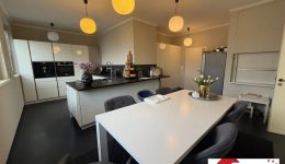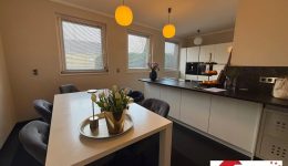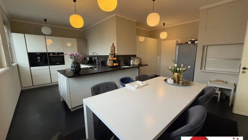 Auch die etwa 39 m² große Wohnküche überzeugt durch ihre Großzügigkeit und hochwertige Ausstattung. Die exquisite Einbauküche fügt sich harmonisch in den Grundriss ein und bietet ausreichend Platz für eine gemütliche Sitzecke. Ein besonderes Komfortdetail ist der integrierte Küchenlift, der direkt zur Garage im Untergeschoss führt und den Transport von Einkäufen besonders bequem gestaltet.