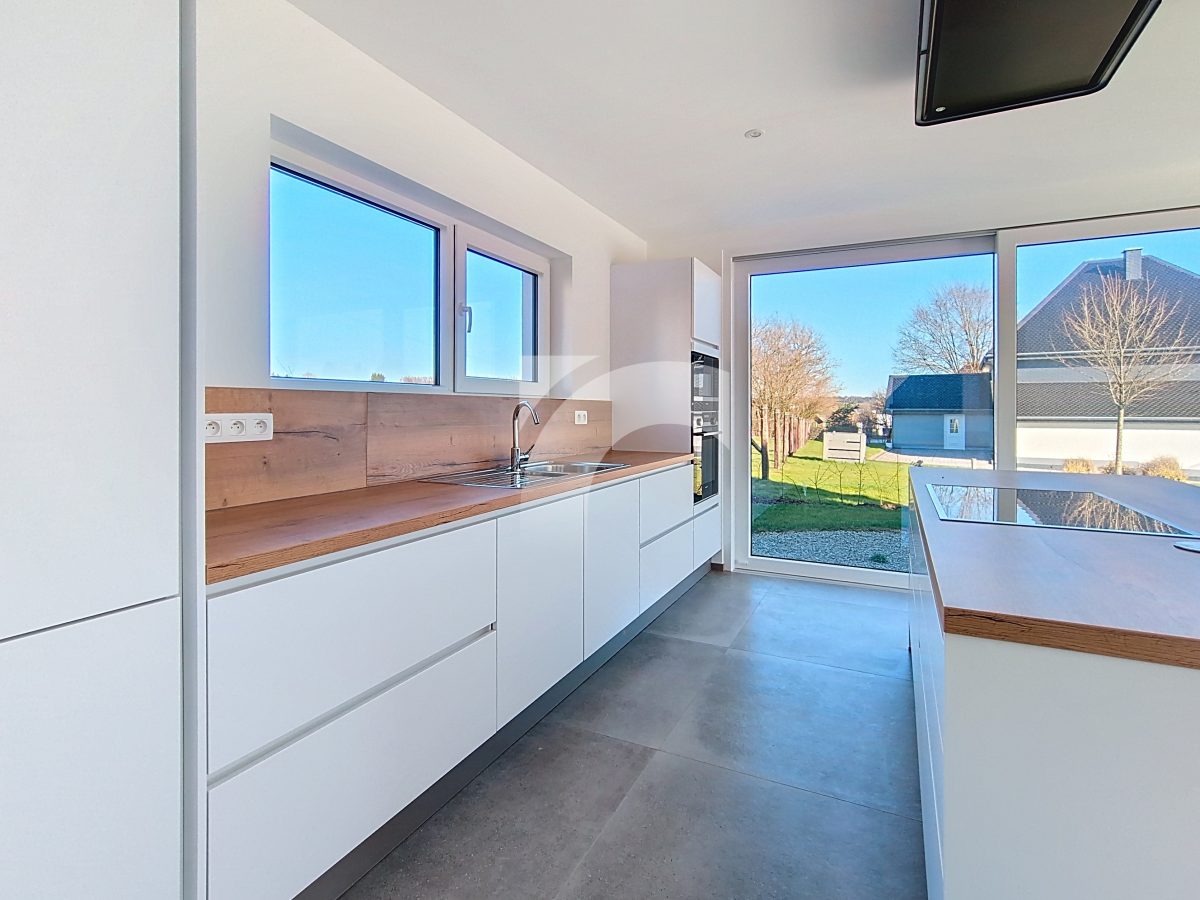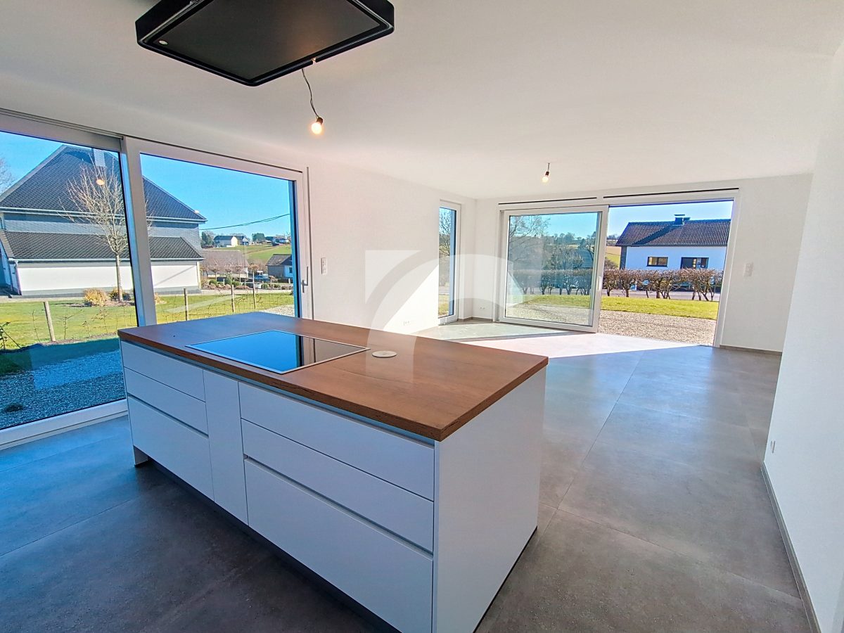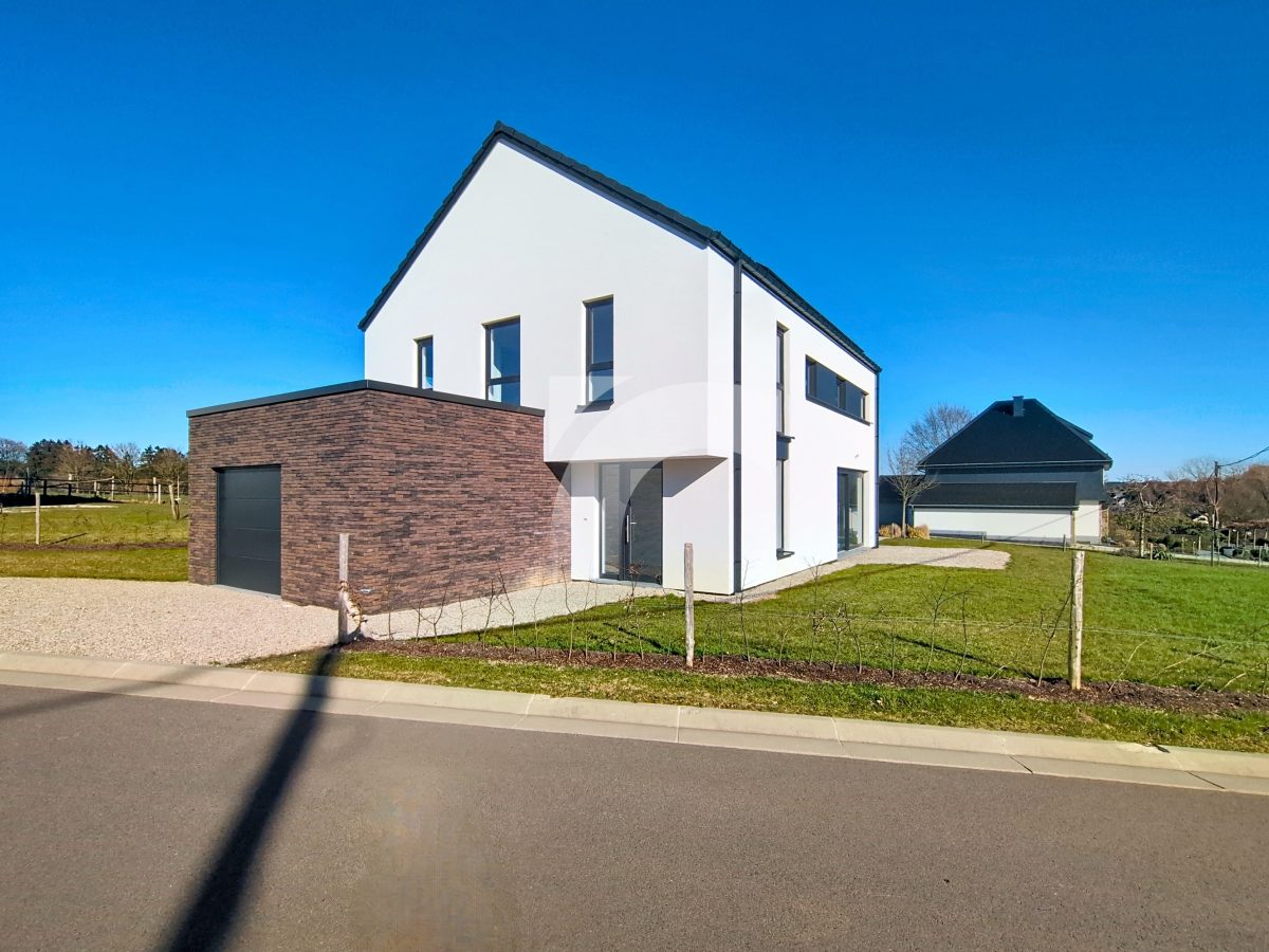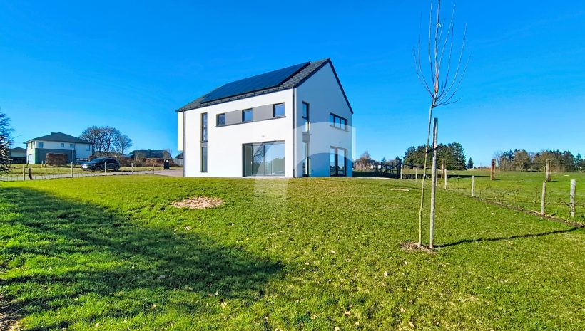 Büllingen Malmedyer Str., 58: Modernes Null-Energie-Haus in ruhiger Lage mit herrlicher Aussicht, nur wenige Minuten vom Zentrum von Büllingen entfernt. Das Haus bietet einen großen Wohn-Essbereich mit moderner Einbauküche, ein großzügiges Elternschlafzimmer mit eigenem Bad sowie Ankleide- und Abstellraum, drei weitere Schlafzimmer, ein hochwertiges Badezimmer, eine praktische Waschküche und einen isolierten, ausbaufähigen Dachboden. Hochwertige Ausstattung wie Fußbodenheizung (Erdgeschoss + Badezimmer im Obergeschoss) über Wärmepumpe, Photovoltaikanlage, einflutige Lüftung Typ C, Regenwassertank, PVC-Doppelverglasung und eine Garage mit motorisiertem Tor sorgen für modernen Komfort und Energieeffizienz. Das Erdgeschoss und Badezimmer sind elegant mit großen Fliesen und die Schlafzimmer und Diele mit warmem Parkett ausgelegt. Der gepflegte Außenbereich mit Rasen, Hecken, Steinbelag vor dem Haus und zwei geschotterte Terrassen, davon eine nach Süden ausgerichtet. Ein perfekt durchdachtes Zuhause, das modernes Wohnen, Nachhaltigkeit und Familienfreundlichkeit ideal verbindet.