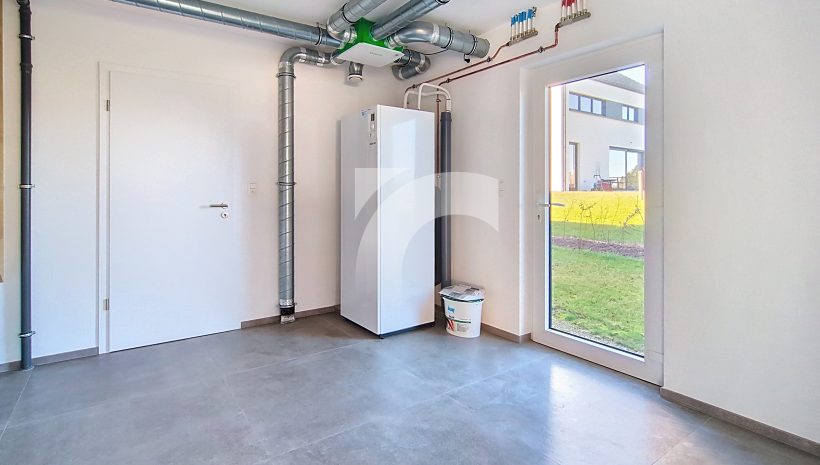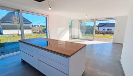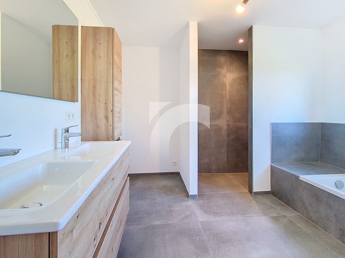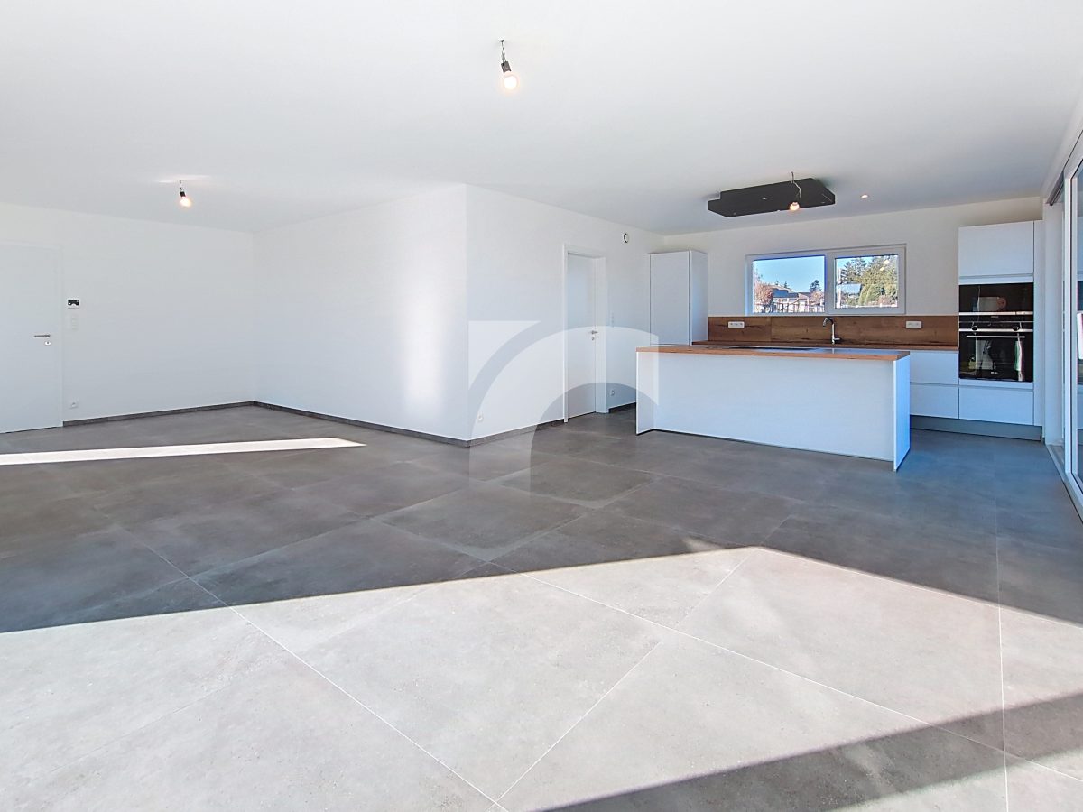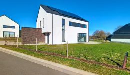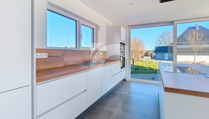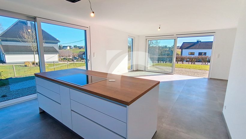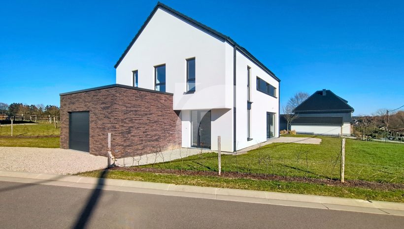 Büllingen Malmedyer Str., 58: Modernes Null-Energie-Haus in ruhiger Lage mit herrlicher Aussicht, nur wenige Minuten vom Zentrum von Büllingen entfernt. Das Haus bietet einen großen Wohn-Essbereich mit moderner Einbauküche, ein großzügiges Elternschlafzimmer mit eigenem Bad sowie Ankleide- und Abstellraum, drei weitere Schlafzimmer, ein hochwertiges Badezimmer, eine praktische Waschküche und einen isolierten, ausbaufähigen Dachboden. Hochwertige Ausstattung wie Fußbodenheizung (Erdgeschoss + Badezimmer im Obergeschoss) über Wärmepumpe, Photovoltaikanlage, einflutige Lüftung Typ C, Regenwassertank, PVC-Doppelverglasung und eine Garage mit motorisiertem Tor sorgen für modernen Komfort und Energieeffizienz. Das Erdgeschoss und Badezimmer sind elegant mit großen Fliesen und die Schlafzimmer und Diele mit warmem Parkett ausgelegt. Der gepflegte Außenbereich mit Rasen, Hecken, Steinbelag vor dem Haus und zwei geschotterte Terrassen, davon eine nach Süden ausgerichtet. Ein perfekt durchdachtes Zuhause, das modernes Wohnen, Nachhaltigkeit und Familienfreundlichkeit ideal verbindet.