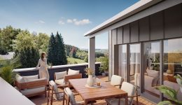 Die Wohnungen mit 1 bis 4 Zimmern und 86 bis 174 Quadratmetern bieten eigene Terrassen oder Balkone sowie Tiefgarage und Außenstellplätze. Energieeffizienz Klasse A, nachhaltige Technik und Massivbauweise sorgen für ein komfortables und zukunftssicheres Zuhause. Ein Friseursalon im Erdgeschoss ergänzt den Alltag direkt vor Ort.