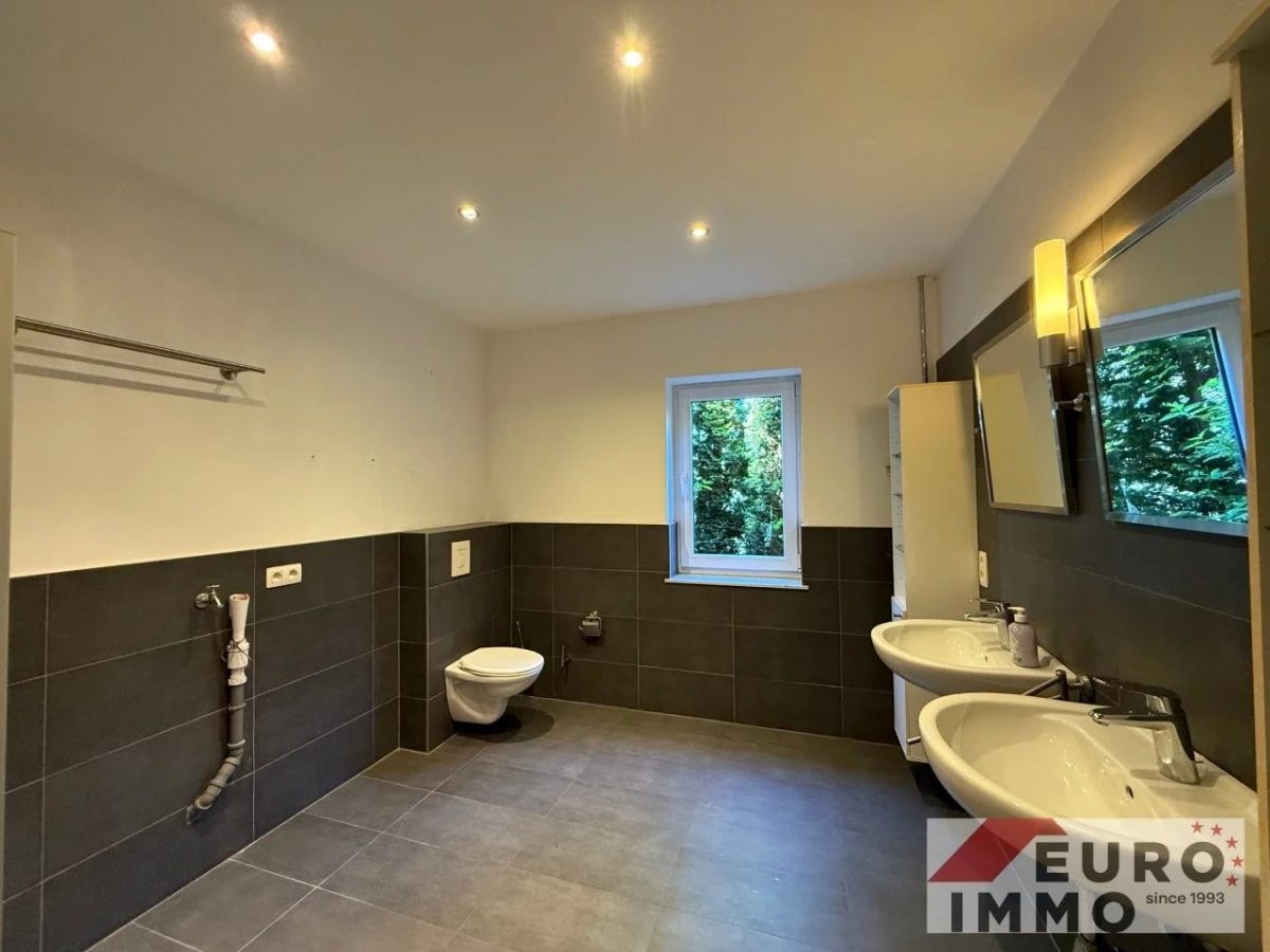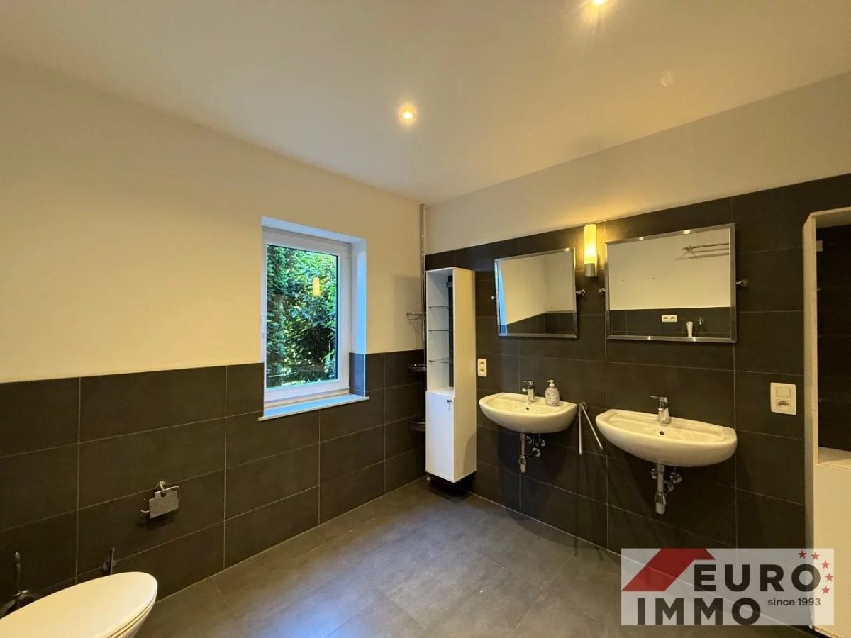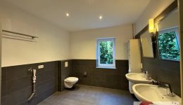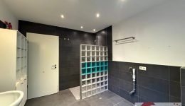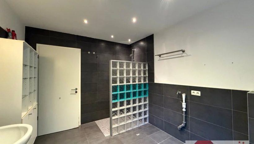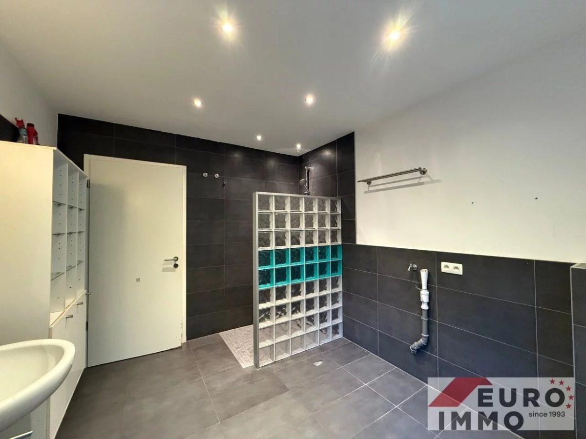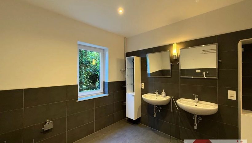 Noch ein paar Stufen tiefer beginnt der moderne, neu gebaute Wohnbereich. Hier überzeugt ein stilvoll gefliestes Badezimmer (ca. 8,5 m²) in Grautönen – mit bodengleicher Dusche, Doppelwaschbecken, WC und Anschluss für die Waschmaschine. Direkt in Verbindung liegt ein ruhiges Schlafzimmer (ca. 20 m²) mit bodentiefen Fenstern und Zugang zum Garten – ein Ort der Stille, perfekt zum Abschalten.