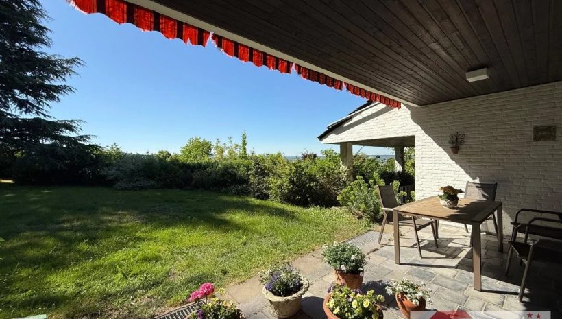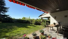 Angrenzend liegt die überdachte Terrasse (ca. 20 m²) – mit Natursteinbelag, offenem Kamin und Südausrichtung – ein Ort für laue Sommerabende, goldene Herbstnachmittage oder stimmungsvolle Winterabende. Dank Markise und Überdachung lässt sich dieser Bereich das ganze Jahr über genießen.