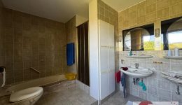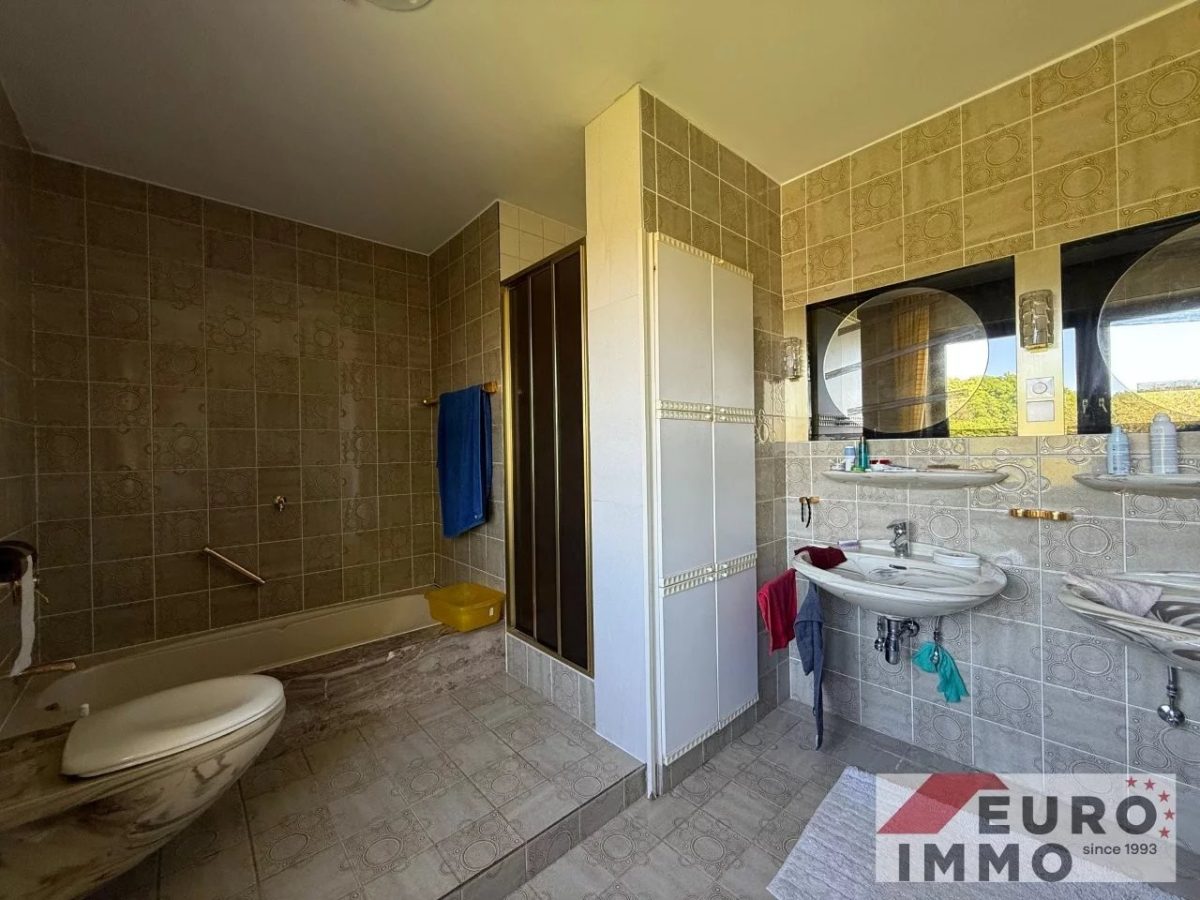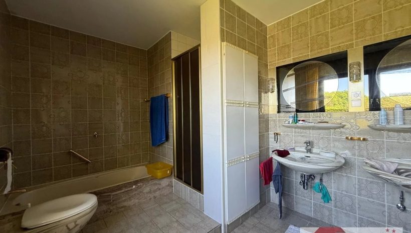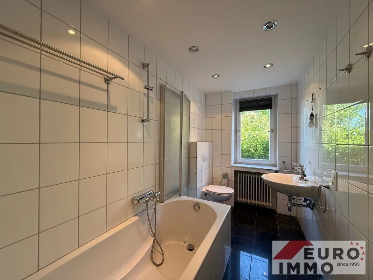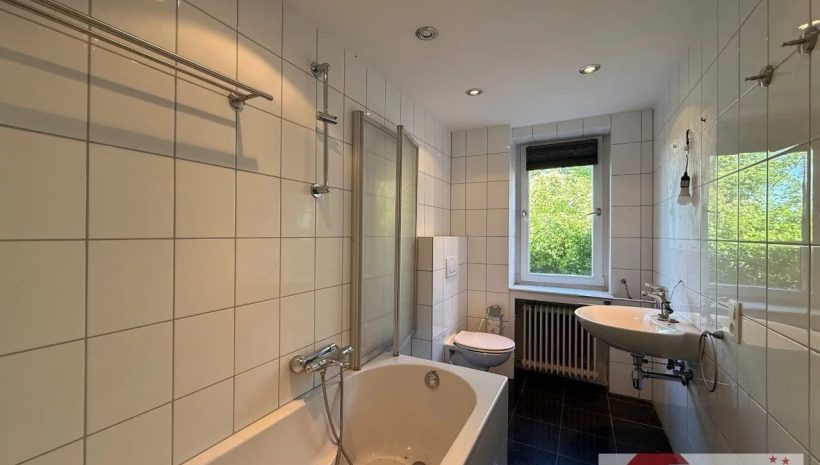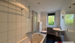 Das dazugehörige Badezimmer (ca. 10 m²), im Stil des Baujahrs, ist gepflegt und voll funktional. Es bietet Badewanne, Dusche, WC, Doppelwaschbecken sowie einen praktischen Einbauschrank – bereit für ein stilvolles Update oder sofortigen Gebrauch.