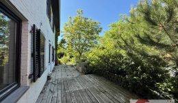 Besonders einladend wirkt das zweite Schlafzimmer auf dieser Ebene – mit seinen ca. 21 m², Zugang zur seitlichen Terrasse mit Bankirai-Holzbelag (ca. 14 m²) und angrenzender gefliester Fläche (ca. 18 m²) bietet es einen wunderbaren Rückzugsort mit direktem Gartenzugang. Ein Ort für Sommersonne am Morgen, einen Kaffee im Freien oder ganz einfach: Zeit für sich.