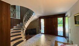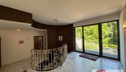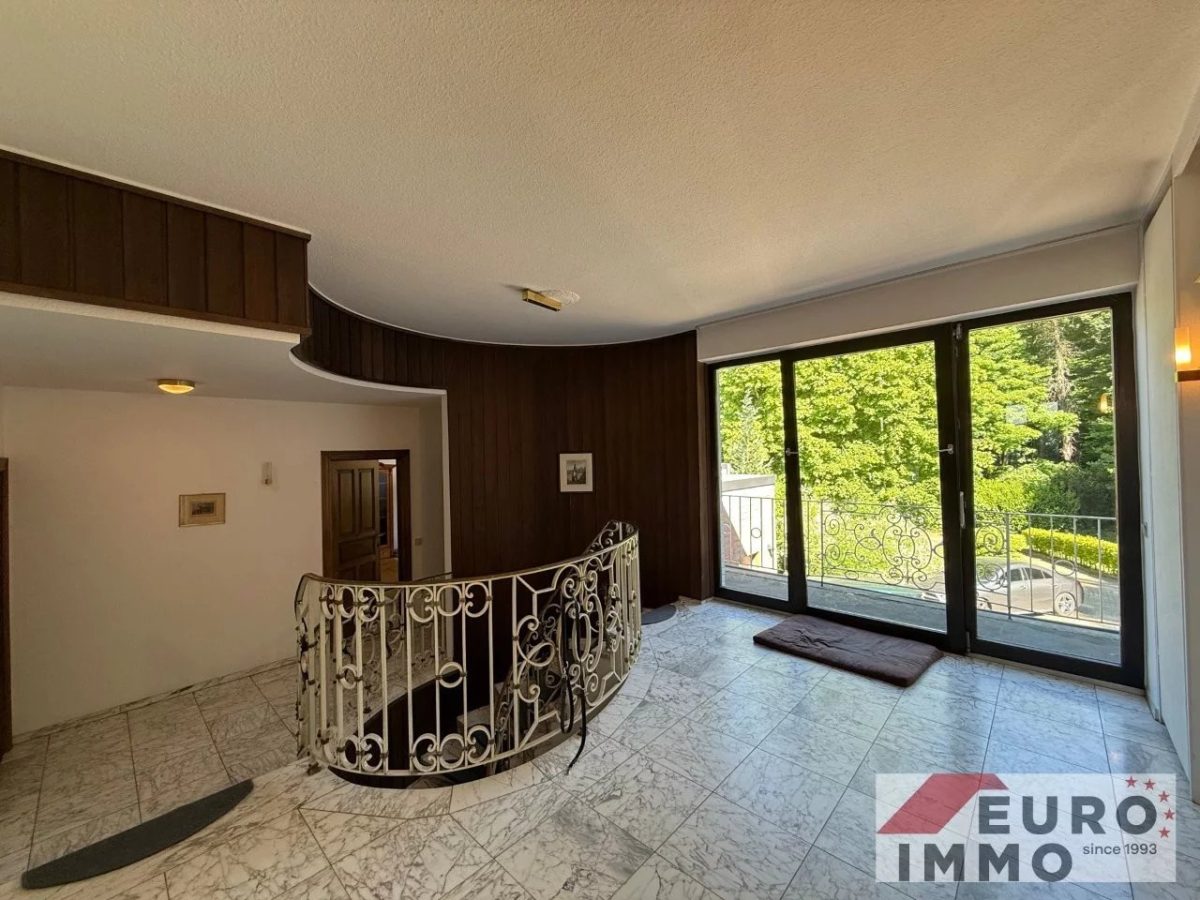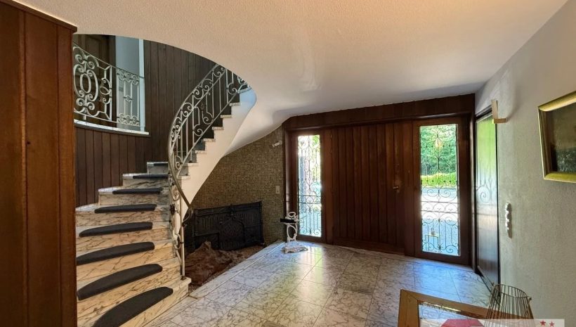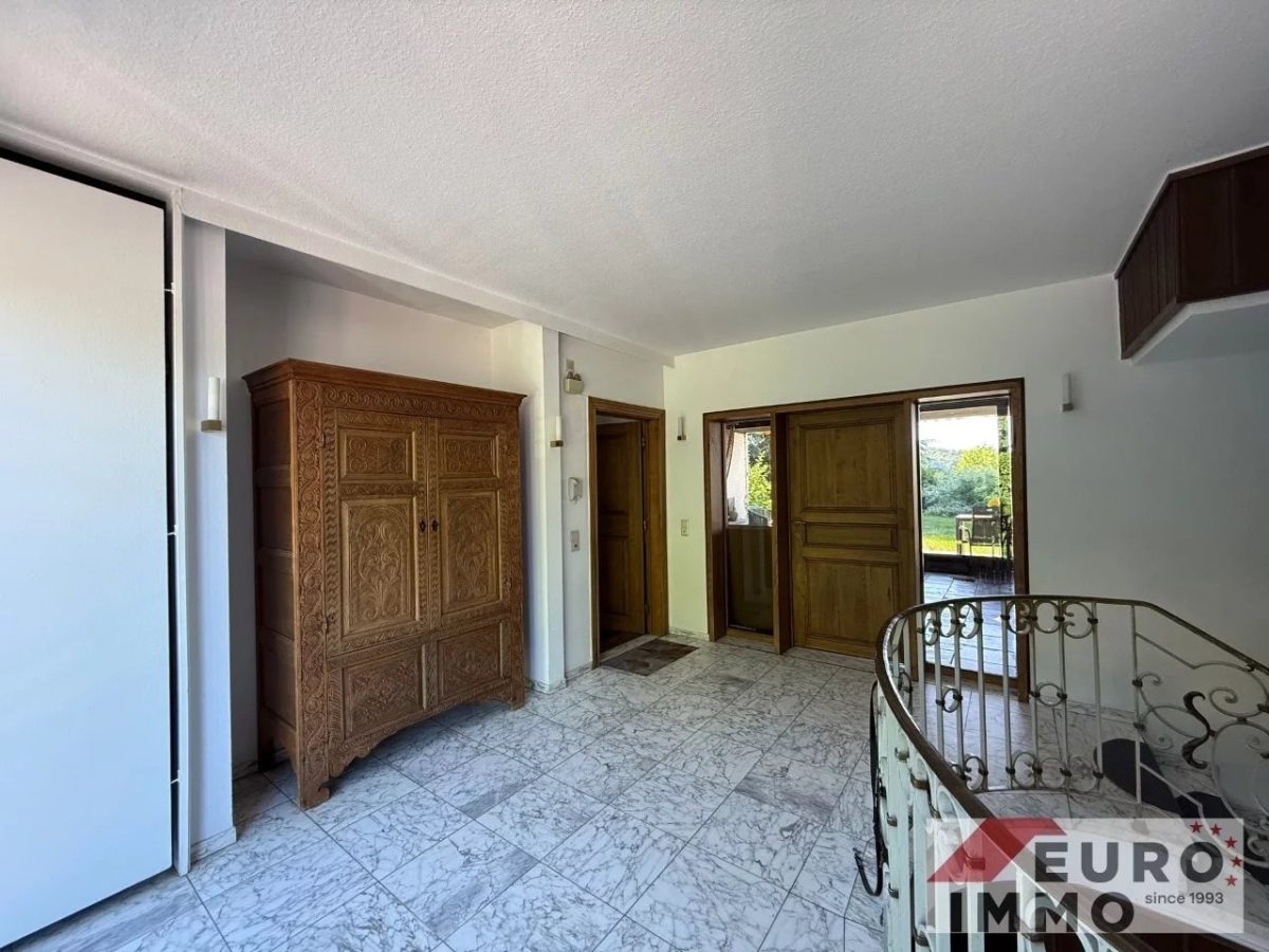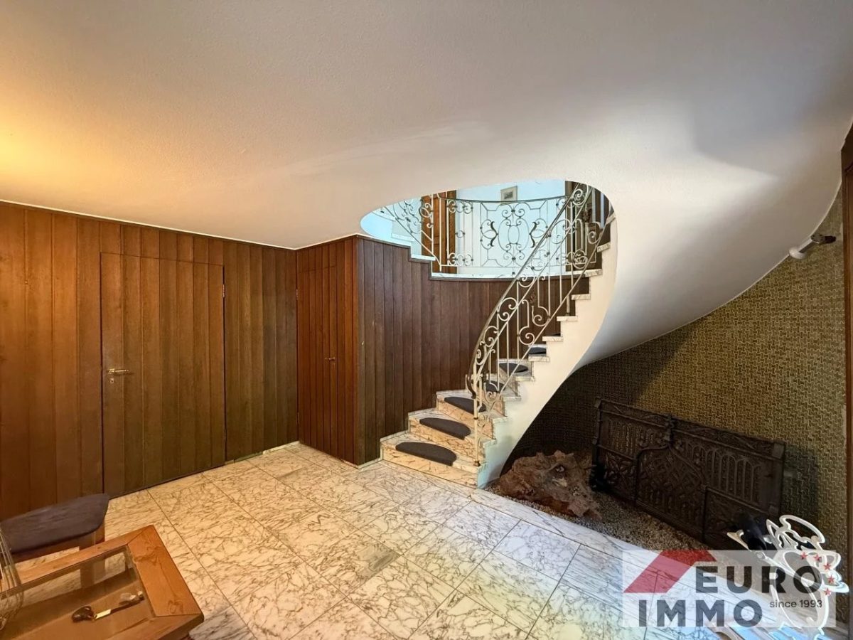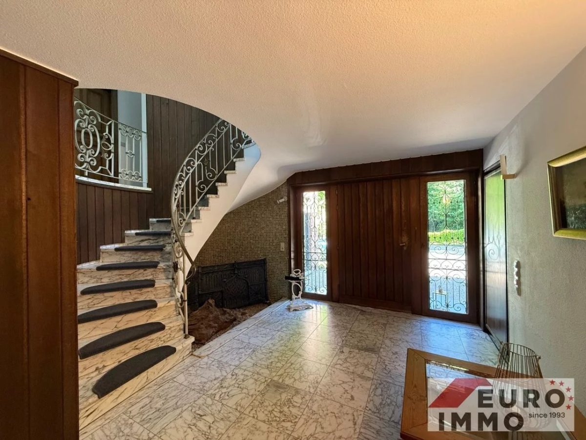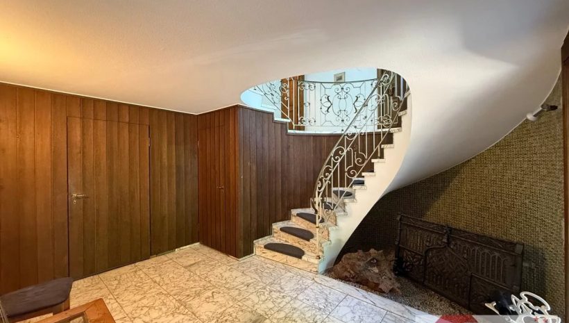 Schon die teilverglaste Eingangstür verrät, dass es sich hier nicht um ein gewöhnliches Haus handelt. Großzügige Proportionen, viel Tageslicht und liebevoll gewählte Materialien prägen den ersten Eindruck: Ein Boden in Marmoroptik, wandverkleidetes Holz, eine imposante Steintreppe mit ornamentiertem, geschmiedetem Metallgeländer – und darunter eine kleine Steinecke, die wie dafür gemacht scheint, mit einem besonderen Detail oder einem Lieblingsstück zum Leben erweckt zu werden.