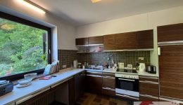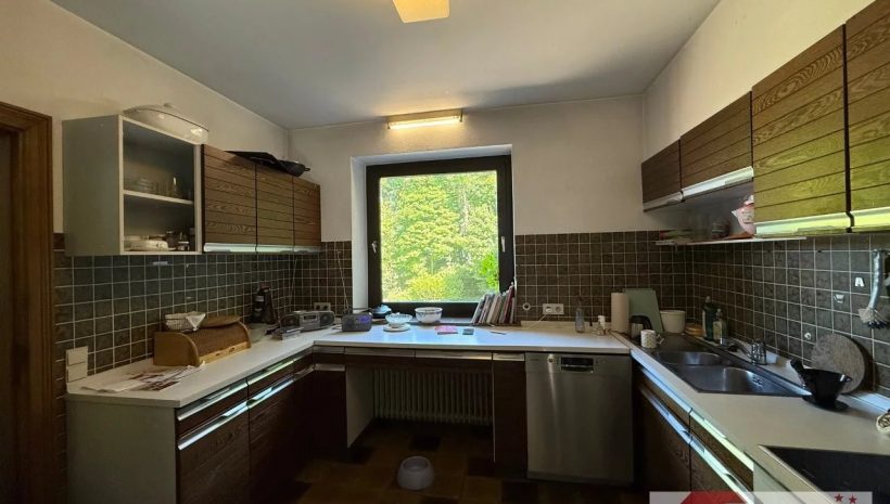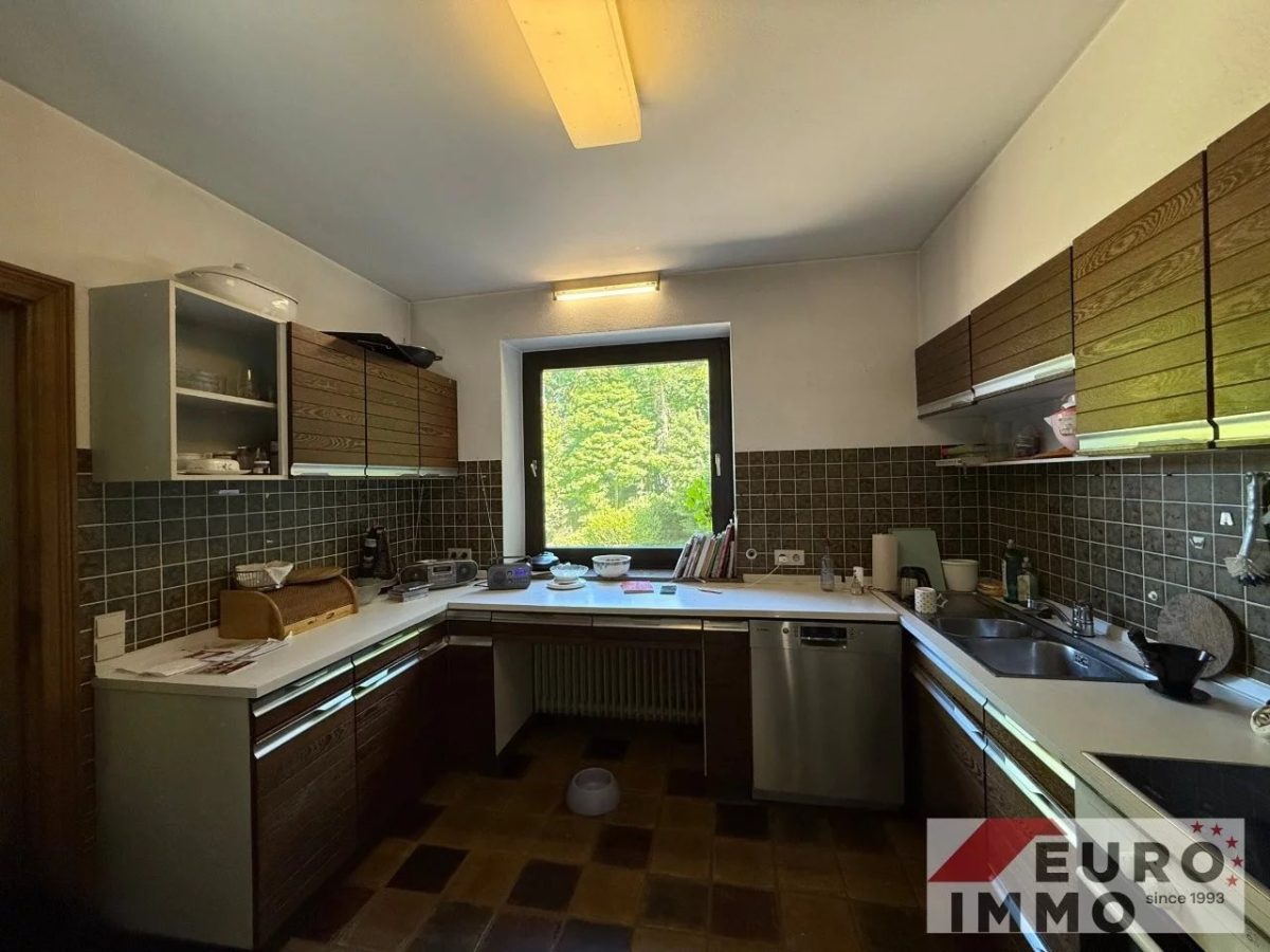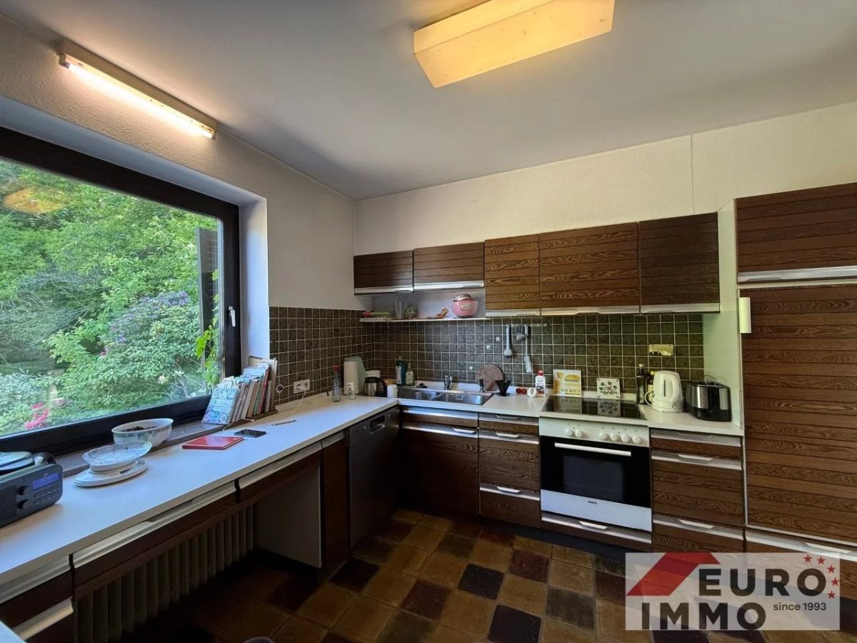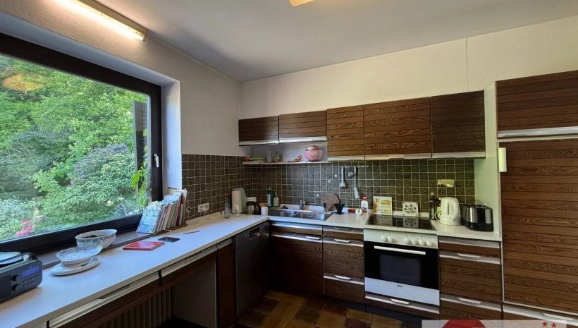 Die Küche (ca. 10 m²) ist in ihrem ursprünglichen Zustand erhalten, funktionstüchtig und bereit für neue Ideen. Mit warmen Naturfliesen ausgestattet und Blick in den Garten, lädt sie ein zur Einrichtung einer gemütlichen Essecke – ein Ort für Frühstücke mit Morgensonne und guten Gesprächen.