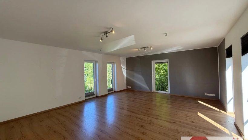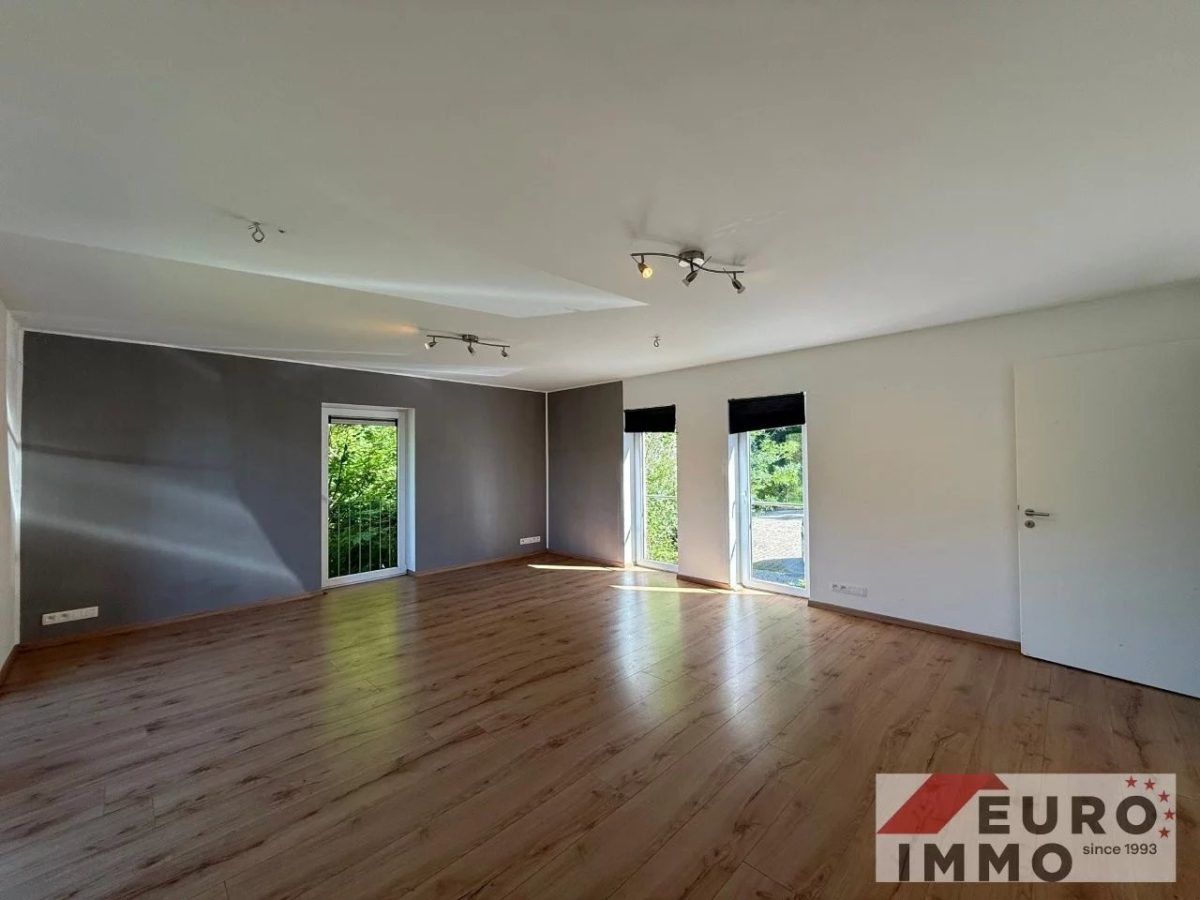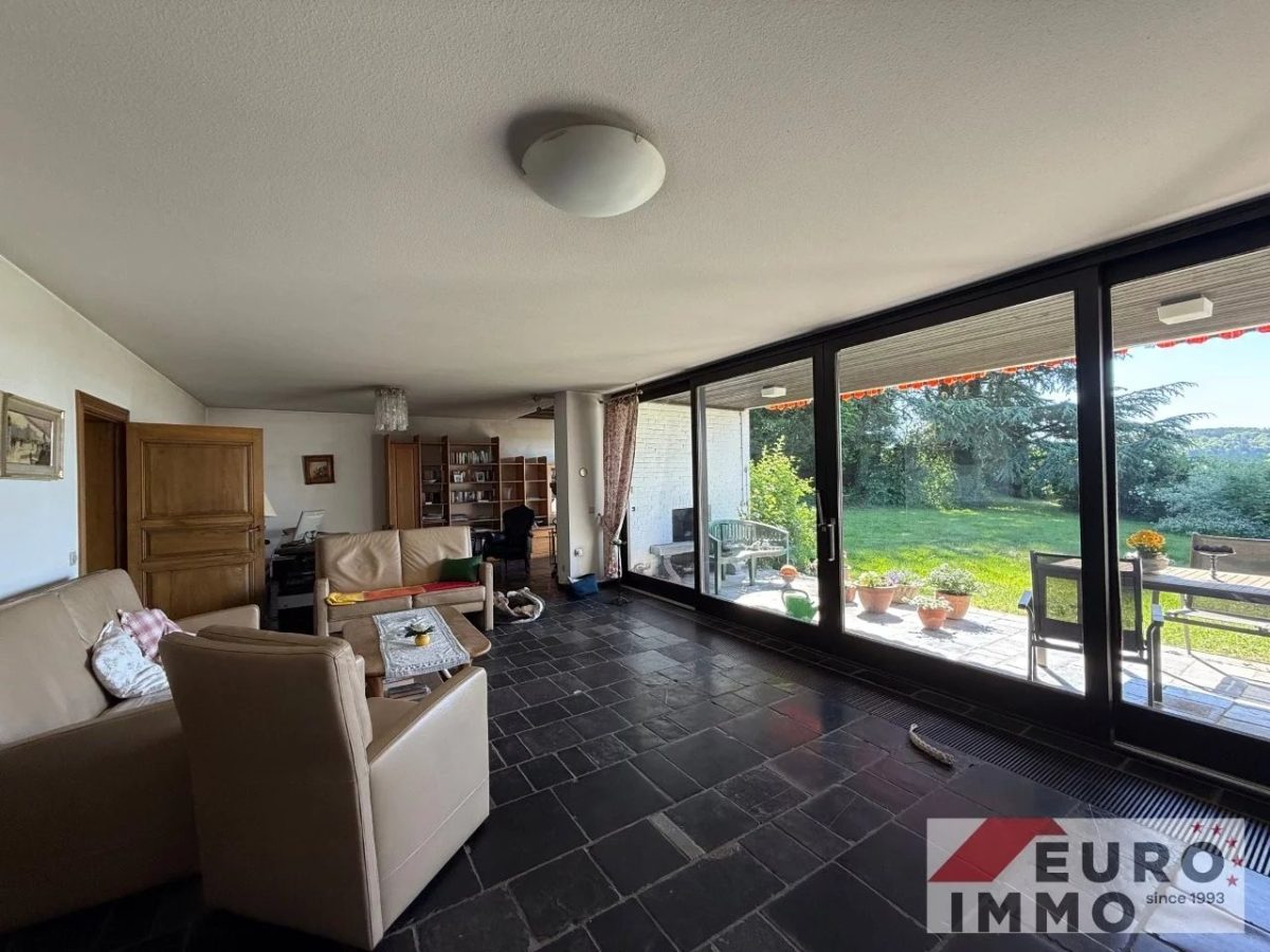 Das wahre Herzstück aber ist das Wohnzimmer: Ein großzügiger Raum mit weitem Blick ins Grüne, der durch seine klare Architektur, den edlen Blausteinboden und den integrierten Unterflurkonvektor zum Wohlfühlen einlädt. Hier lassen sich verschiedene Wohnideen verwirklichen – mit Ausblick, Ruhe und Charakter.