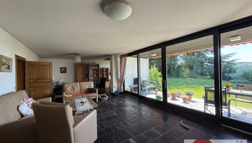 Über eine geflieste Innentreppe gelangt man in das obere Geschoss des Anbaus, wo sich ein lichtdurchfluteter Wohn-/Essbereich (ca. 36 m²) mit großen Fensterflächen öffnet. Der Blick hinaus ins Grüne ist atemberaubend, der Raum warm, klar und einladend. Hier entstehen Begegnung, Gemütlichkeit und Weite zugleich.