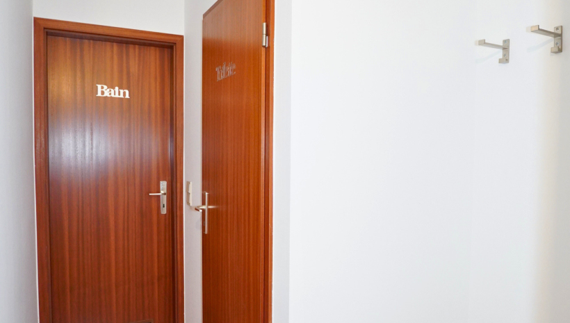 Eingangsbereich, Garderobe, separates WC, geräumiges Wohnzimmer mit Fenstertür zum großen Balkon, schöne ausgestattete Küche, zwei Schlafzimmer, ein Badezimmer mit Badewanne, Waschbecken und Anschluss für eine Waschmaschine.