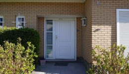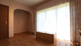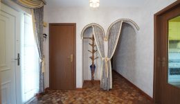 Der einladende Eingangsbereich führt zu allen Räumen des Hauses, umfasst ein separates WC sowie einen Garderobenbereich, der durch eine gewölbte Öffnung dezent abgetrennt ist. Durch eine verglaste Holzdoppeltür gelangt man in das geräumige und lichtdurchflutete Wohnzimmer, während die Einbauküche einen direkten Zugang zum Außenbereich bietet.