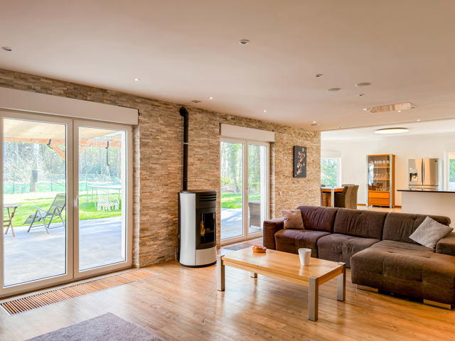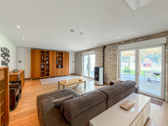 Das Untergeschoss bietet mit einer 260 m² großen Kellerfläche und einer Deckenhöhe von 3 Metern außergewöhnlich viel Stauraum. Technisch ist die Villa mit PVC-Doppelverglasung, Pelletöfen in den Hauptbereichen sowie einer zentralen Pelletheizung ausgestattet.
