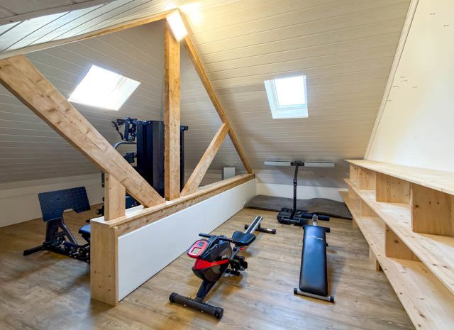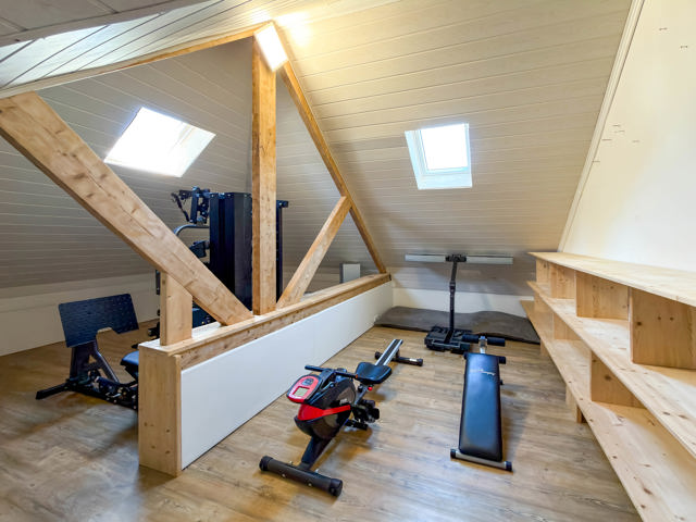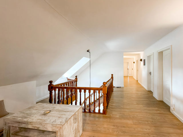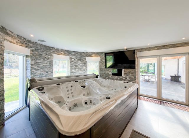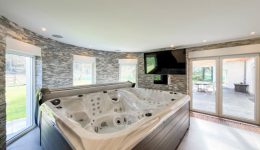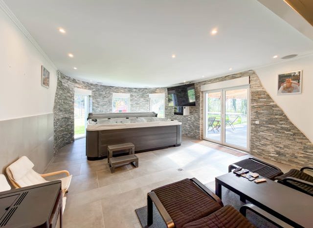 Ein besonderes Highlight ist der Wellnessbereich mit Jacuzzi und Sauna sowie Zugang nach außen, der für ein hohes Maß an Lebensqualität sorgt. Im Obergeschoss befinden sich acht Schlafzimmer, darunter ein beeindruckendes Spielzimmer von 75 m² sowie ein Fitnessraum, die vielfältige Nutzungsmöglichkeiten bieten.