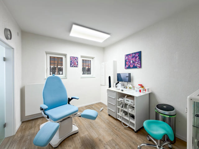 Das Erdgeschoss mit 265 m² umfasst unter anderem zwei getrennte Gewerbebereiche, darunter eine Praxis von ca. 105 m² mit Empfang und drei Behandlungsräumen, ideal für Freiberufler oder eine Kombination aus Wohnen und Arbeiten. Der Wohnbereich besteht aus einem großzügigen Wohnzimmer mit integriertem Heimkino sowie einer offenen Küche, die direkten Zugang zu einer 40 m² großen Terrasse bietet.