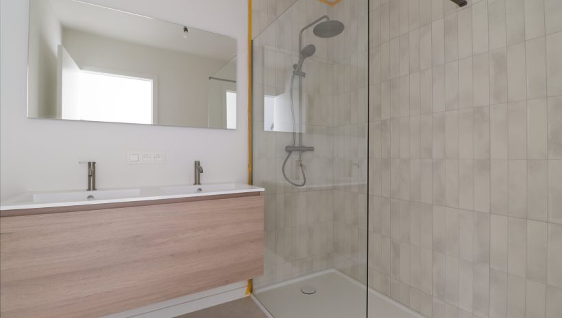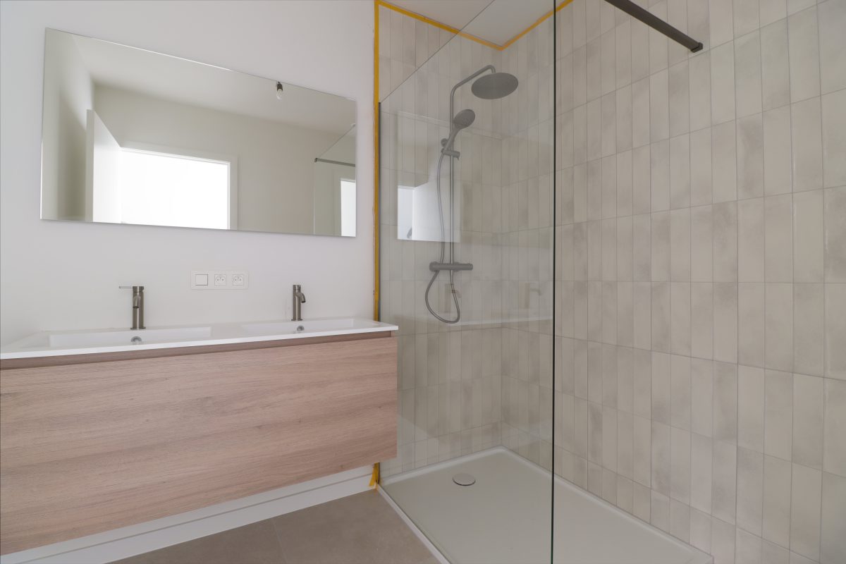 Die Wohnung umfasst außerdem zwei helle Schlafzimmer, einen Abstellraum, ein separates WC und ein Badezimmer, das mit einem Doppelwaschbecken und einer begehbaren Dusche ausgestattet ist.