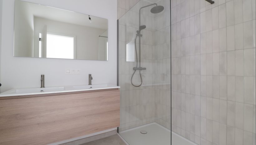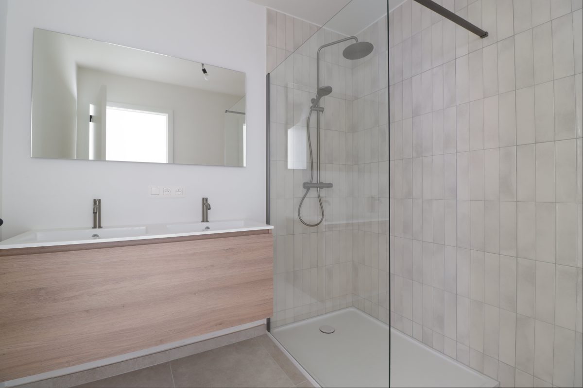 Die Wohnung umfasst außerdem zwei helle Schlafzimmer, einen Abstellraum, ein separates WC und ein Badezimmer, das mit einem Doppelwaschbecken und einer begehbaren Dusche ausgestattet ist.