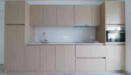 Der Eingang führt direkt in das großzügige, lichtdurchflutete Wohnzimmer. Eine stilvolle Küche ist bereits eingebaut worden. Die großen Schiebeelemente durchfluten den Raum mit Tageslicht. Besonders hervorzuheben sind die zwei Terrassen mit einer Größe von insgesamt 18m², die zum Entspannen an schönen Tagen einladen.